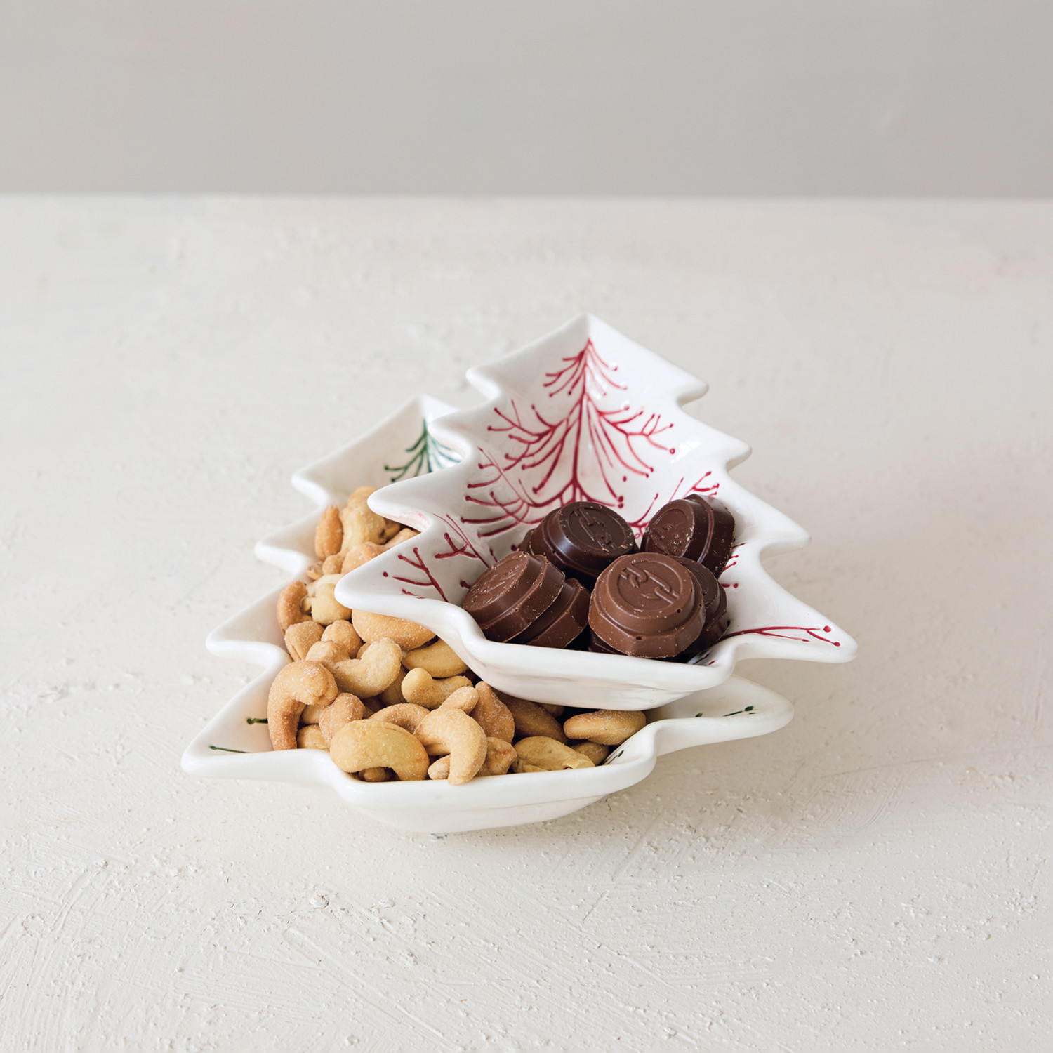 Catalog Name: 7-1/4"L x 6-1/2"W & 6-1/4"L x 5-1/2"W Hand-Painted Ceramic Tree Shaped Dishes, White, Green & Red, Set of 2