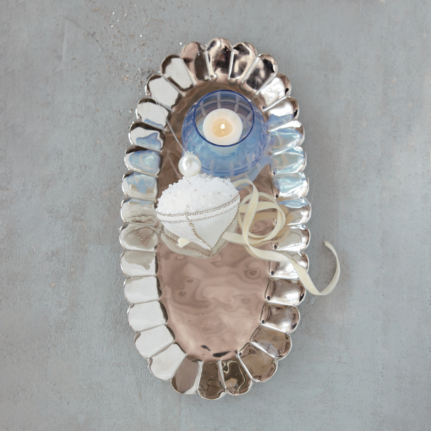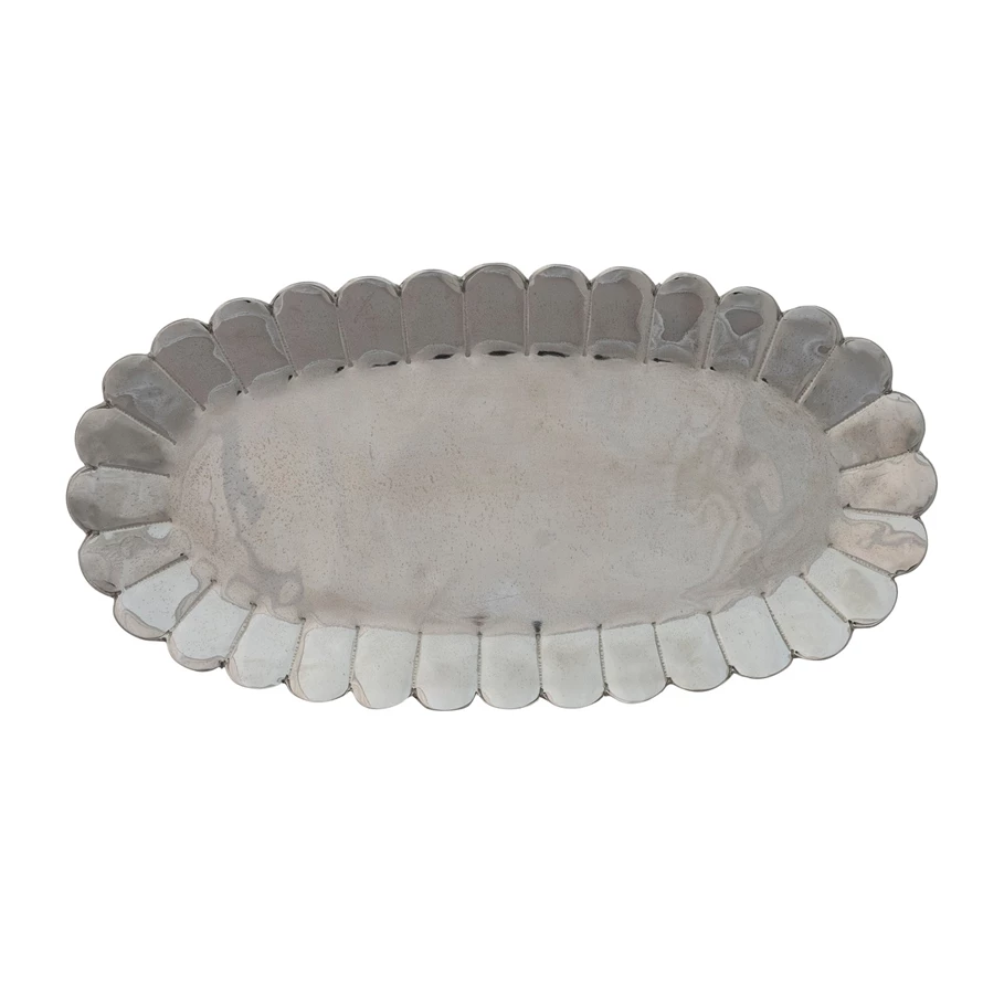 Catalog Name: 16-1/4"L x 8-1/4"W Oval Metal Scalloped Tray, Nickel Finish