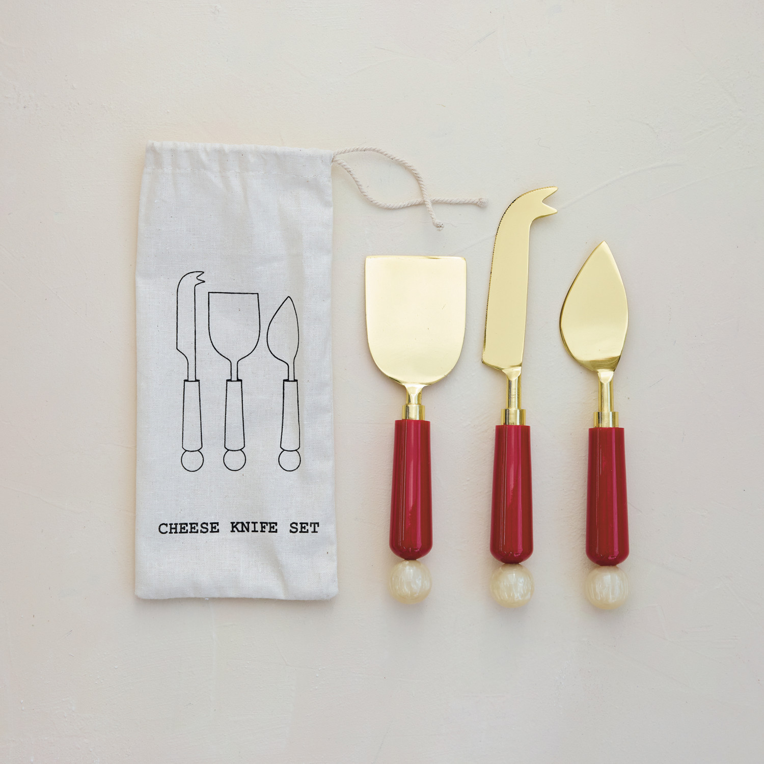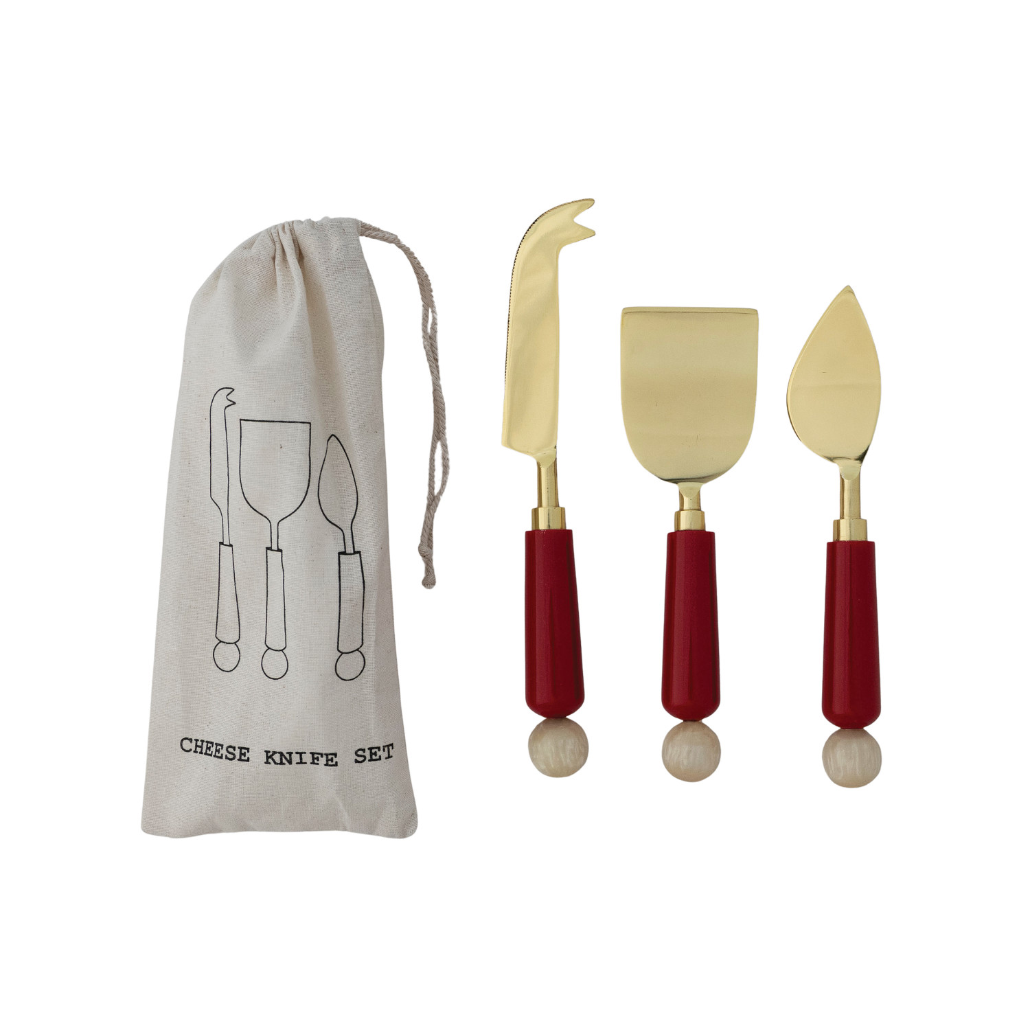 Catalog Name: 7"L - 8-1/2"L Stainless Steel Cheese Knives w/ Marbled Resin Handles, Gold Finish, Red & Cream Color, Set of 3 in Printed Drawstring Bag