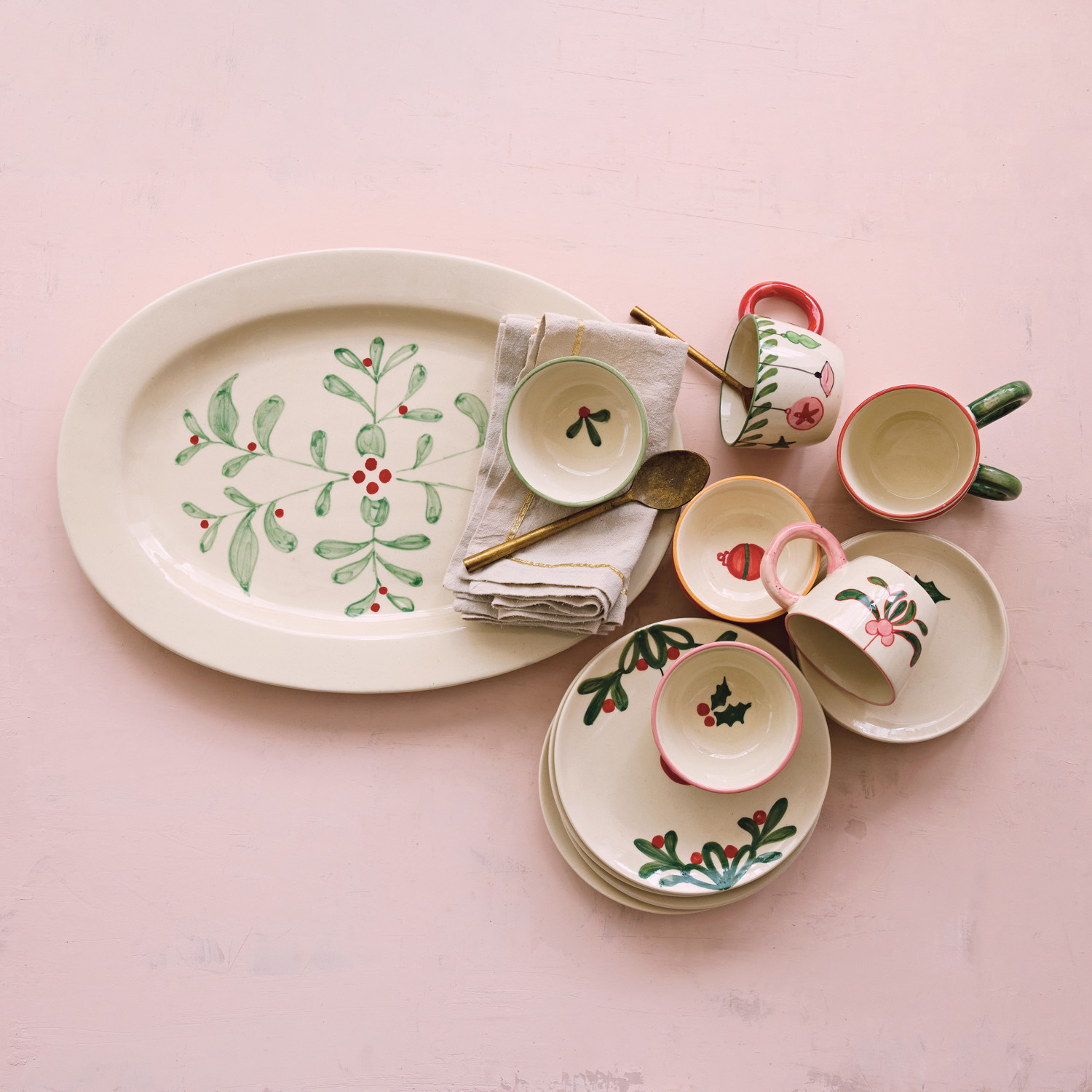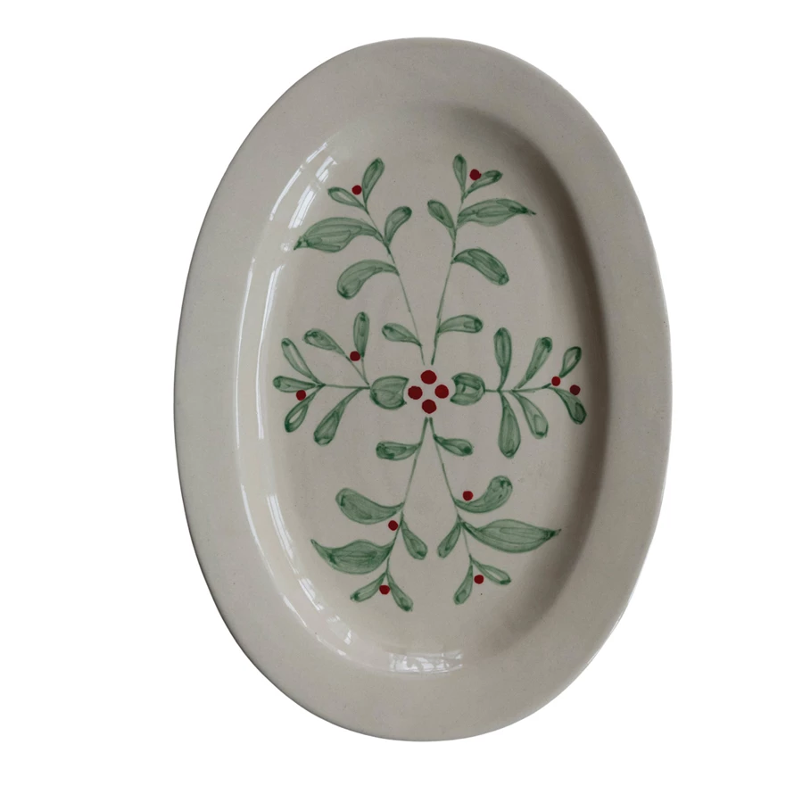 Catalog Name: 18-1/2"L x 13"W Oval Hand-Painted Stoneware Platter w/ Mistletoe, Cream Color, Green & Red (Each One Will Vary)