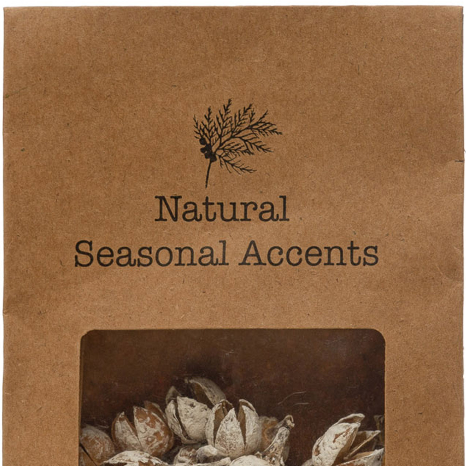 These dried pods are perfect for filling bowls or around festive decor in the holiday season. Made out of dried natural roselle pods come packaged in a printed kraft bag. Add to a seasonal display for a dash of cozy winter charm.