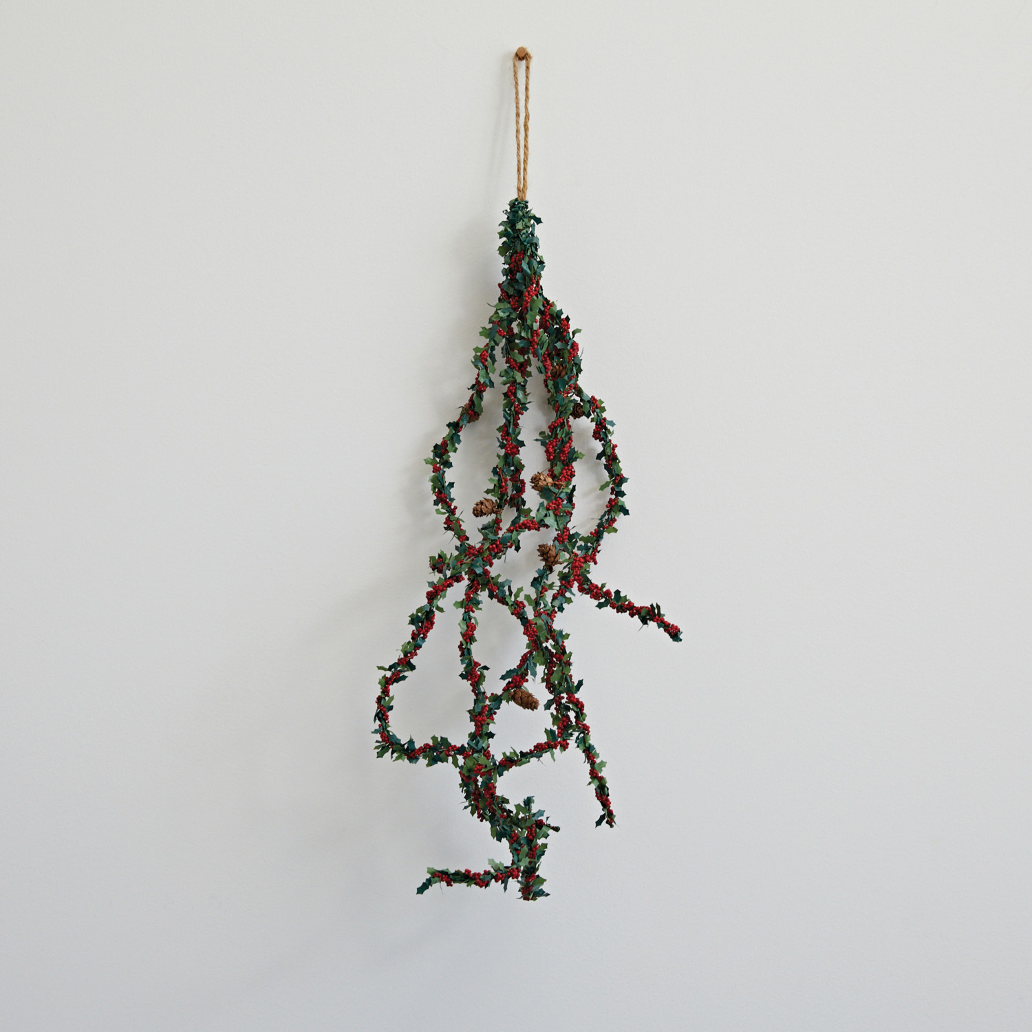 This rustic hanging decoration features faux holly leaf spray with red berries, interwoven with natural pinecones. Transform any space into a winter wonderland with our breathtaking collection of holiday-themed dried and artificial botanicals, featuring a delightful array of lifelike poinsettias, lush holly, Christmas trees, and wreaths.
