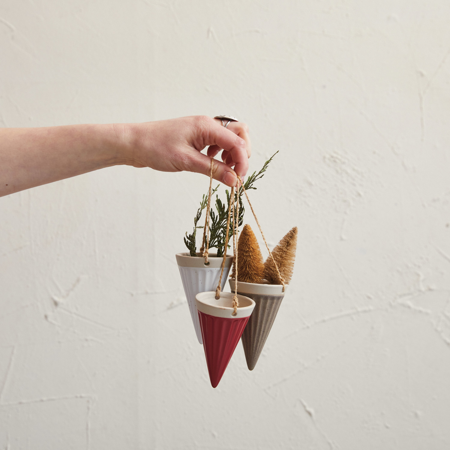 Debossed Stoneware Hanging Cone Vase w/ Jute Rope Hanger, 3 Colors