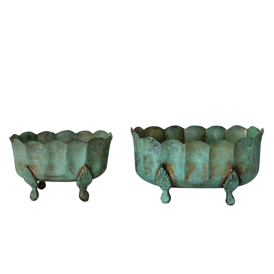 Metal Scalloped Footed Planters, Verdigris Finish, Set of 2