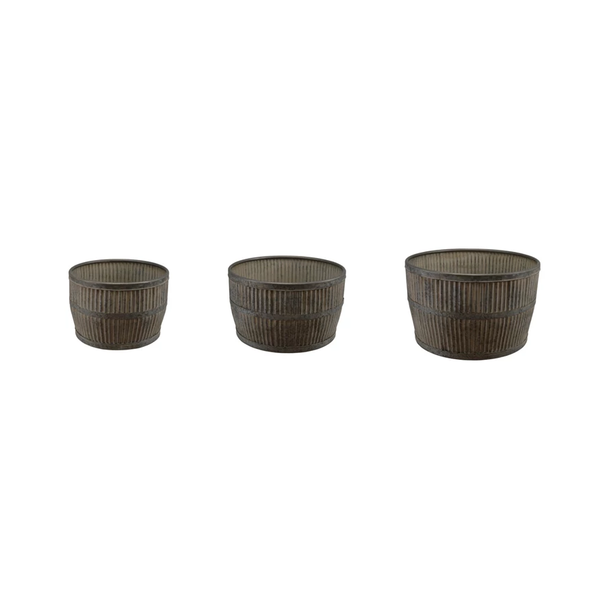 Galvanized Metal Fluted Planters, Antique Zinc Finish, Set of 3