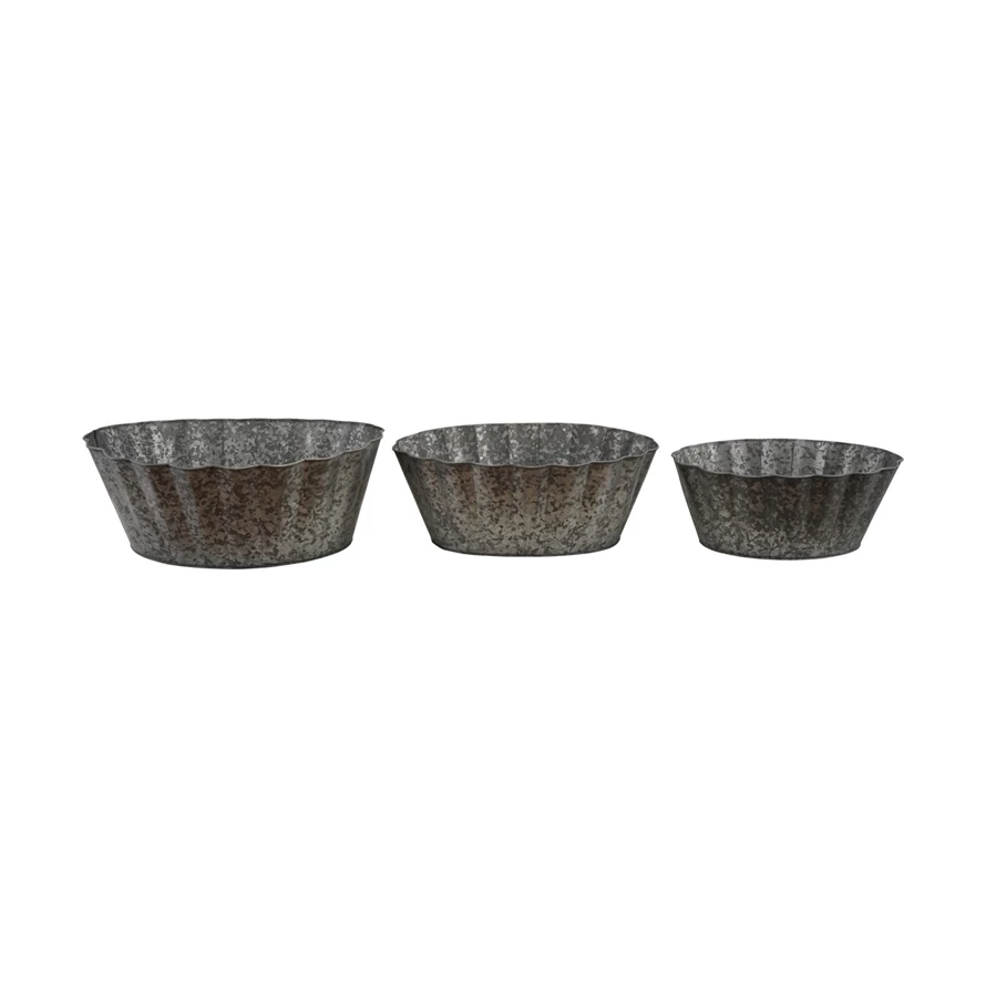 Catalog Name: 17-1/2"L x 12"W x 7"H, 16"L x 11"W x 7"H & 13"L x 9-1/2"W x 5-1/2"H Oval Galvanized Metal Scalloped Planters, Set of 3