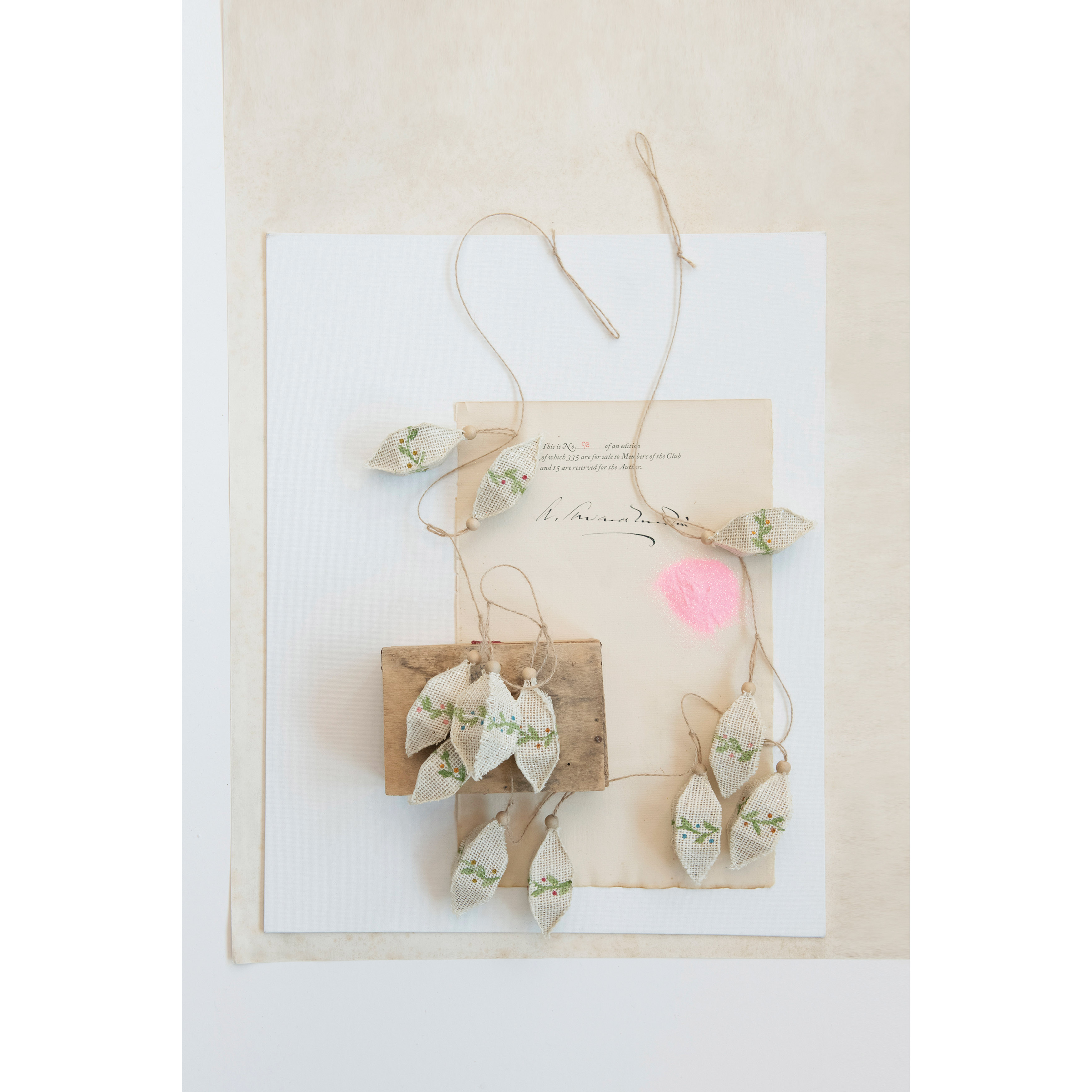 Natural and green hand-painted burlap wrapped garland; Made from 100% paper mache.