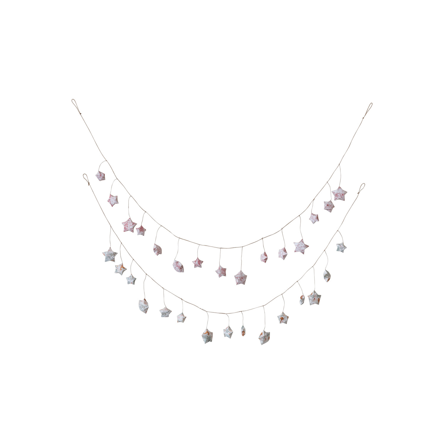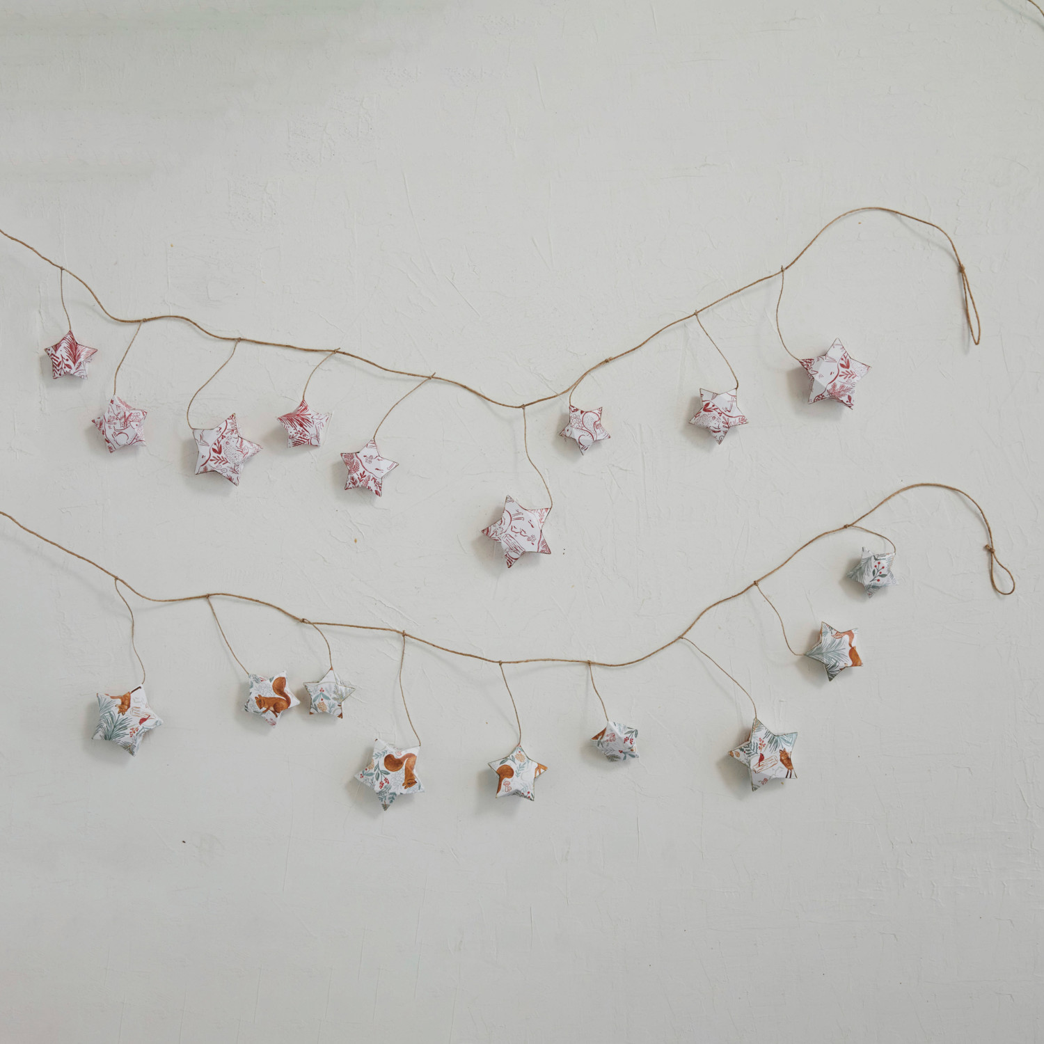 This printed paper star garland set is a festive and charming way to decorate the home. The garland features a colorful and whimsical pattern of flowers, leaves, animals, and stars, in two styles each with its own personality and appeal. The garland is made of high-quality paper and jute that are lightweight and durable, and can be stored and reused easily. The garland measures 72 inches in length, 7 inches in height, and comes in a kraft box for easy packaging and gifting. Use it for holidays, parties, or everyday occasions, as this garland will add some fun and flair to the space. A festive and charming printed paper star garland with woodland flora and fauna pattern in kraft box. A lovely way to decorate the home, as it features a colorful and whimsical pattern of flowers, leaves, animals, and stars, in two styles. Ideal for hanging on walls, windows, doors, mantels, or trees, as it adds some fun and flair to the space.