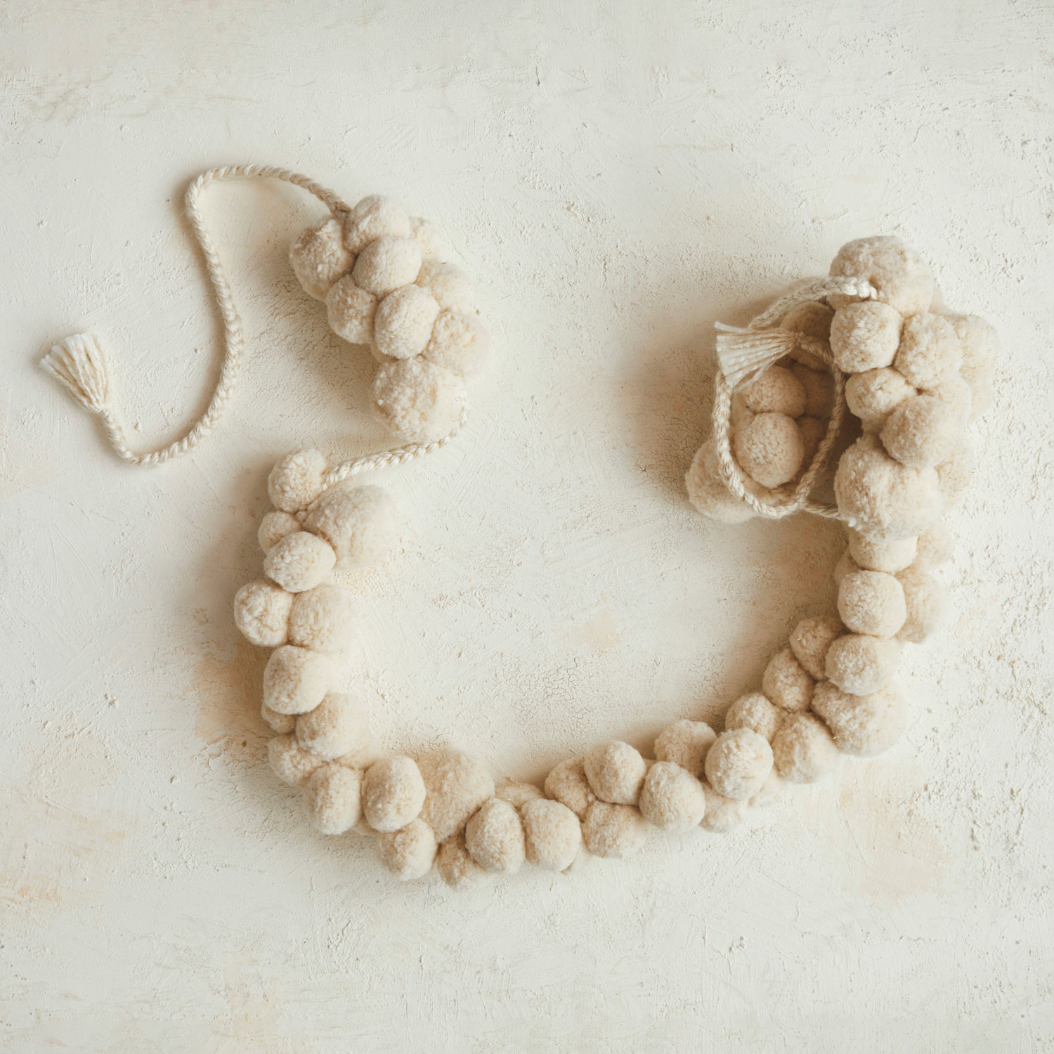 This fabric pom pom swag with metallic gold thread is a statement of elegance and sophistication. Each pom pom is crafted from cream-colored polyester, intertwined with strands of metallic gold that catch the light and add a festive sparkle. The swag extends to 112 inches in length and 3 inches in height, making it a significant decorative element that can transform any space. Whether it's adding a touch of luxury to a wedding, enhancing a holiday display, or simply elevating the home decor, this swag is a versatile and glamorous choice. It's a celebration of texture and shine, bringing a refined and festive atmosphere wherever it's placed. A luxurious swag of cream-colored fabric pom poms, interlaced with shimmering metallic gold thread. An elegant addition that infuses a sense of refined celebration into any decor style. Perfect for draping across mantels, doorways, or as a chic backdrop for special events.