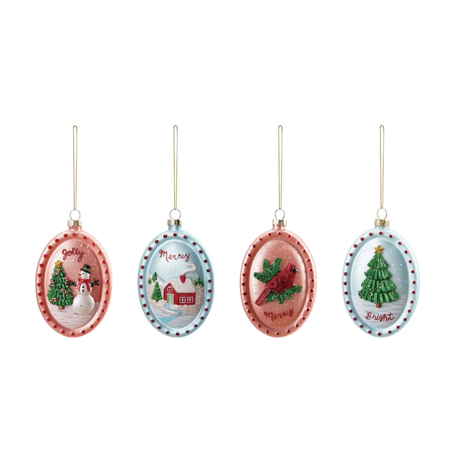 Catalog Name: 4-3/4"H Hand-Painted Glass Ornament w/ Embossed Holiday Image & Word, Multi Color, 4 Styles ©