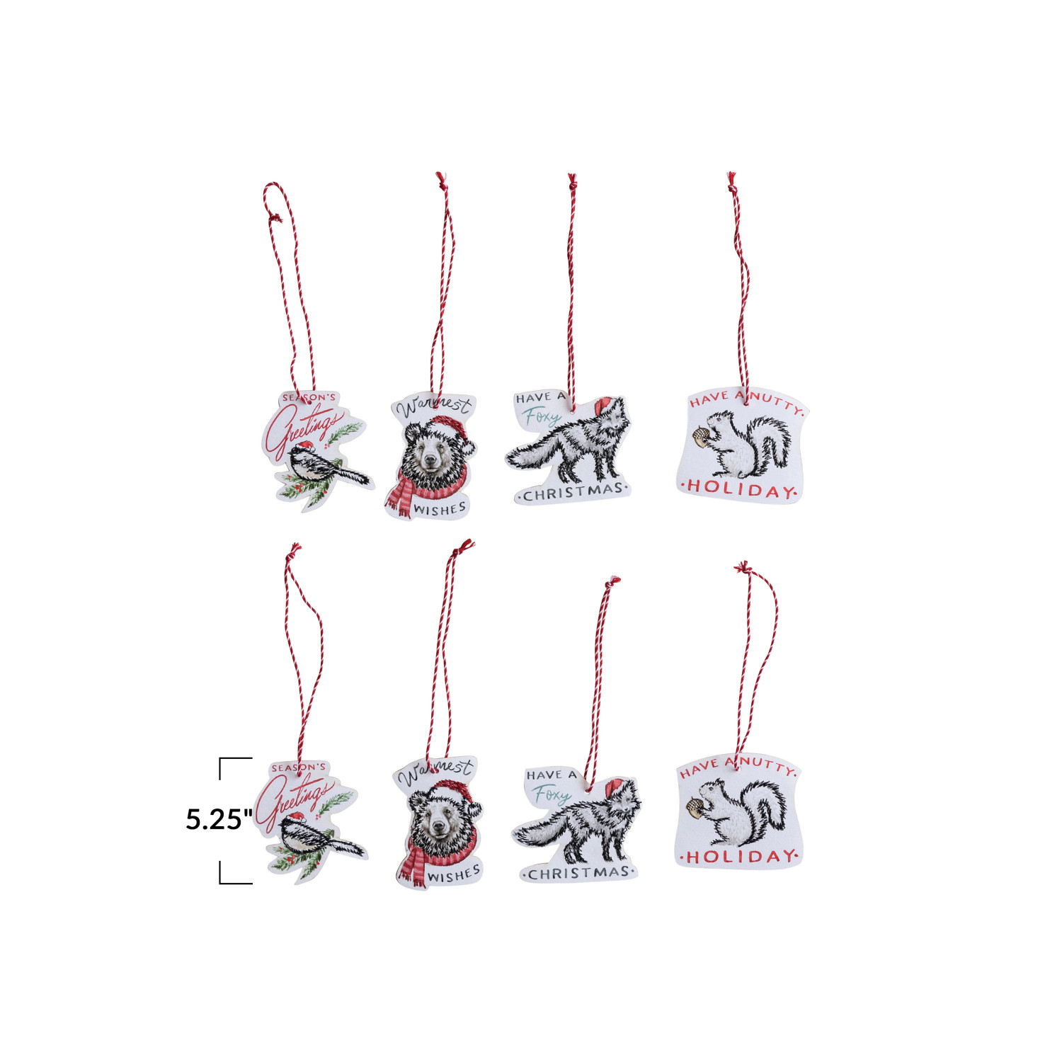 Catalog Name: 5-1/4"H Printed Recycled Paper Ornaments/Gift Tags w/ Holiday Saying, Animal & Embroidery, Multi Color, 4 Styles, Set of 8 ©