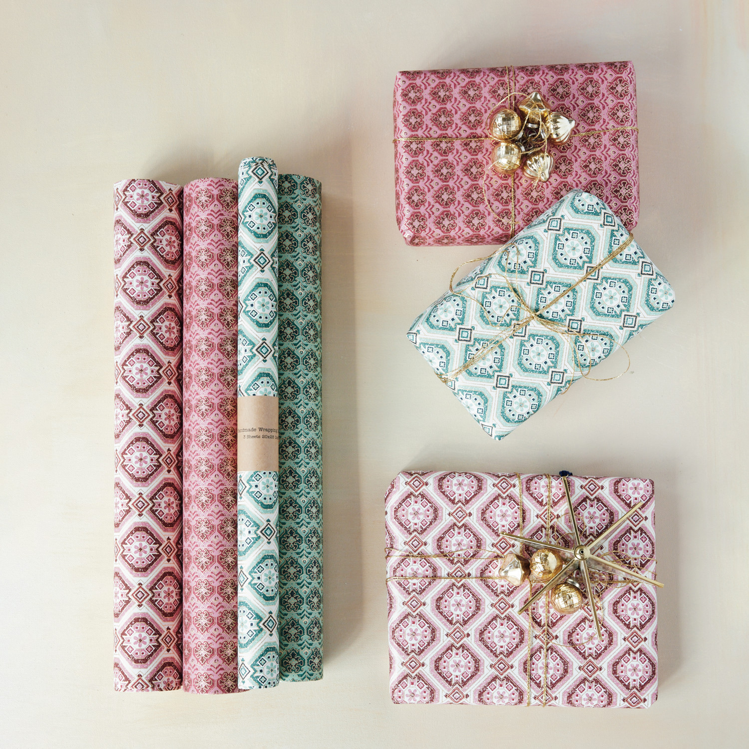 Catalog Name: 28"L x 20"W Handmade Recycled Block Printed Gift Wrapping Paper w/ Pattern, Multi Color, 4 Styles (3 Sheets Per Roll) ©