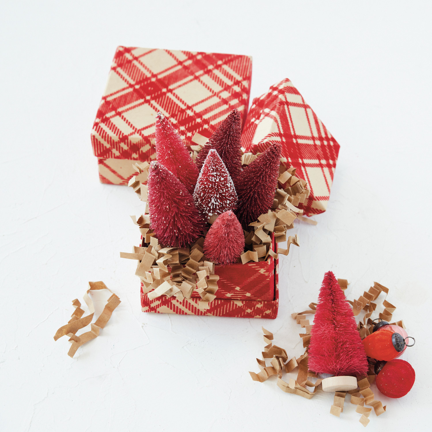 Catalog Name: 5-3/4" Square x 2-3/4"H, 4-3/4" Square x 2-1/4"H & 4" Square x 1-3/4"H Handmade Printed Recycled Flocked Kraft Paper Nesting Gift Boxes w/ Plaid Pattern, Red, Set of 3