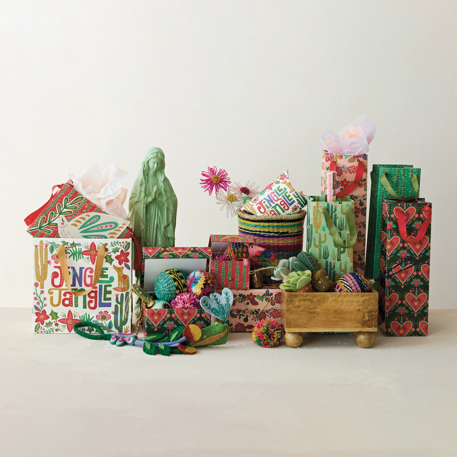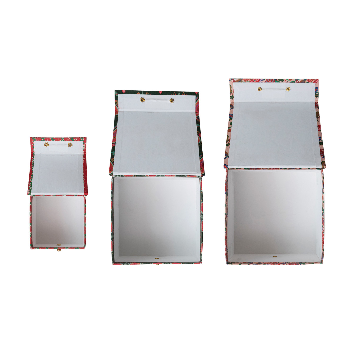 Catalog Name: 8-1/2" Square x 4-1/2"H, 7" Square x 6-3/4"H & 4-1/2" Square x 3"H Handmade Printed Recycled Paper Gift Boxes w/ Seasonal Patterns & Closures, Multi Color, Set of 3 ©
