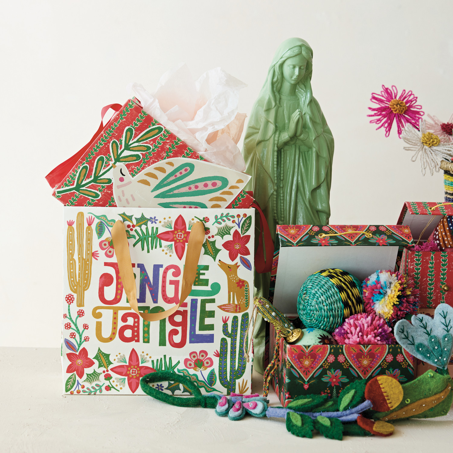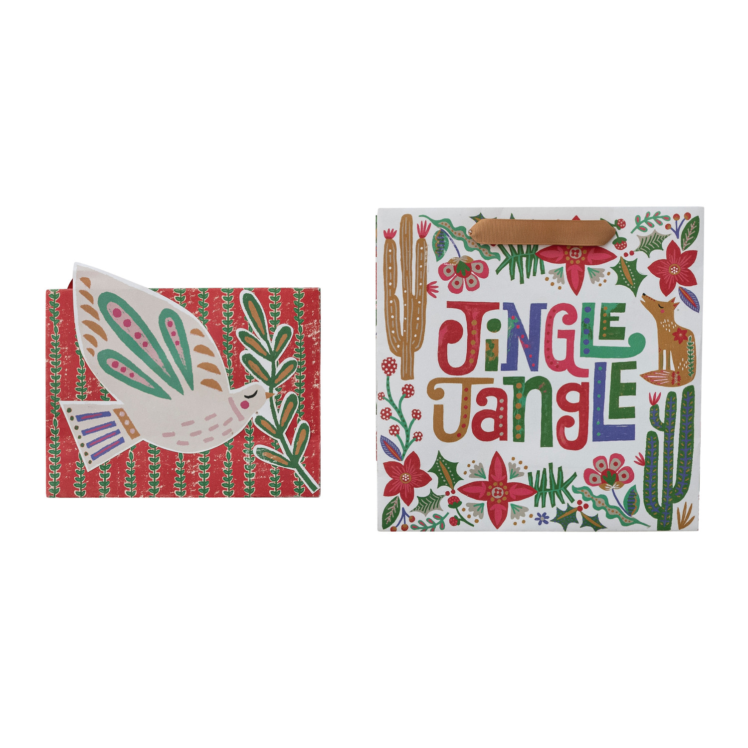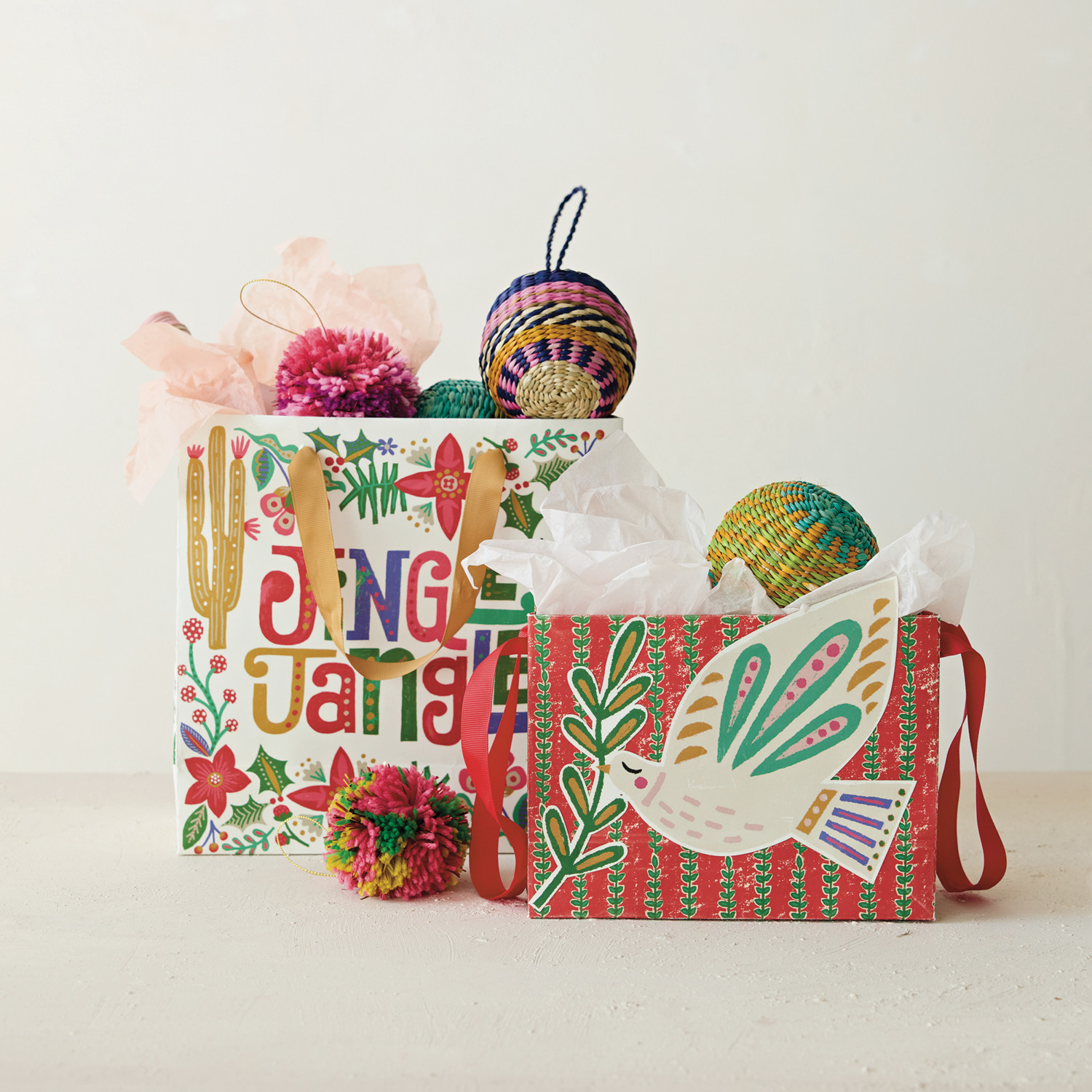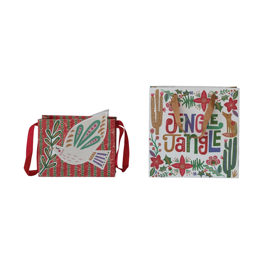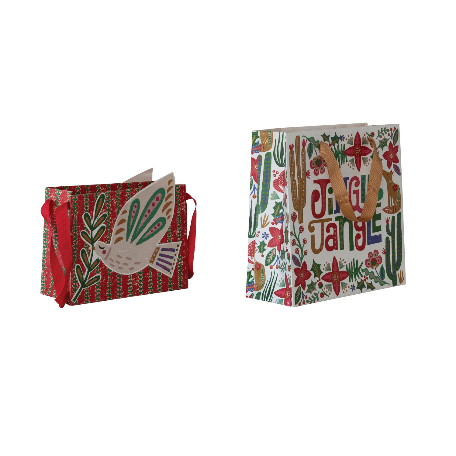 Catalog Name: 10"L x 4"W x 10"H & 8-1/2"L x 3-1/2"W x 6-1/2"H Handmade Printed Recycled Paper Gift Bag w/ Seasonal Pattern, 3D Icon/"Jingle Jangle" & Grosgrain Ribbon Handles, Multi Color, Set of 2
