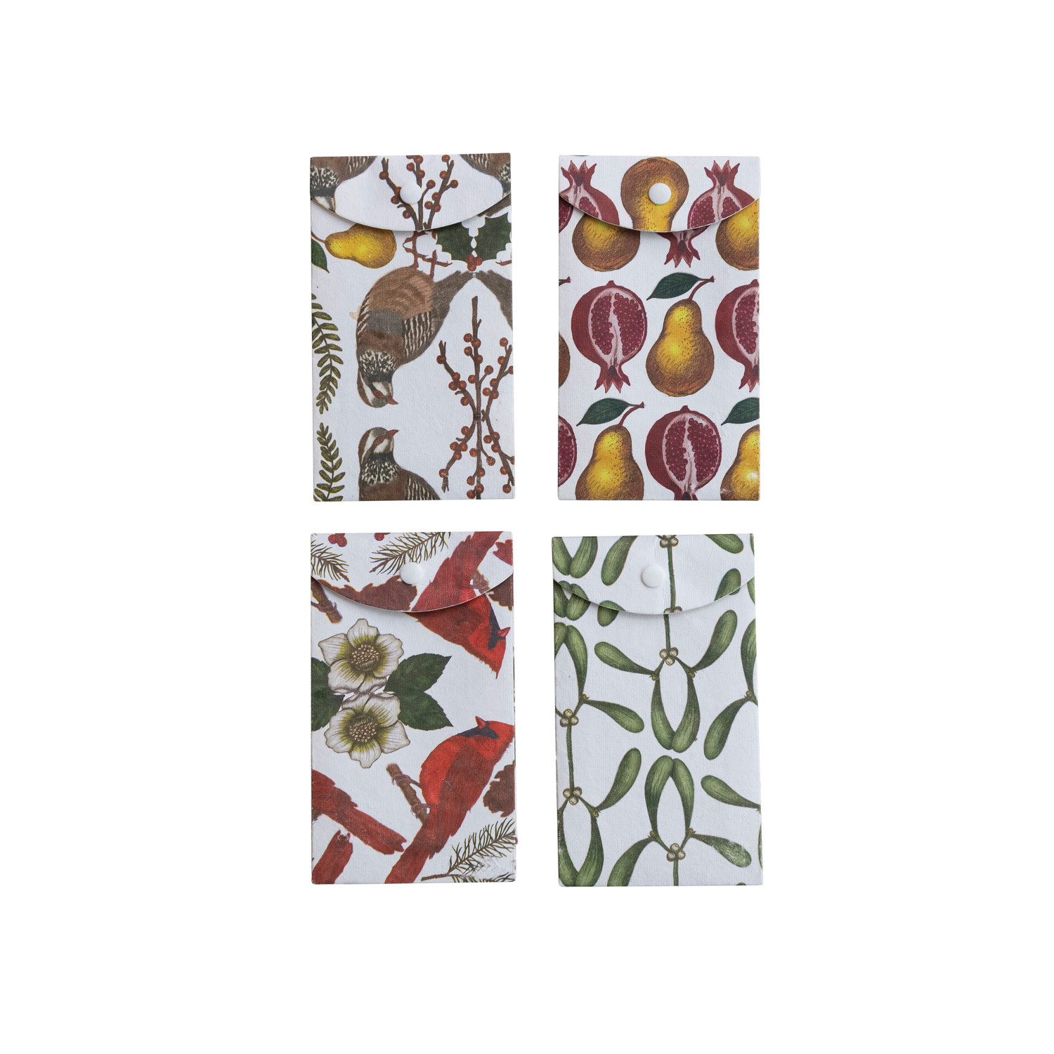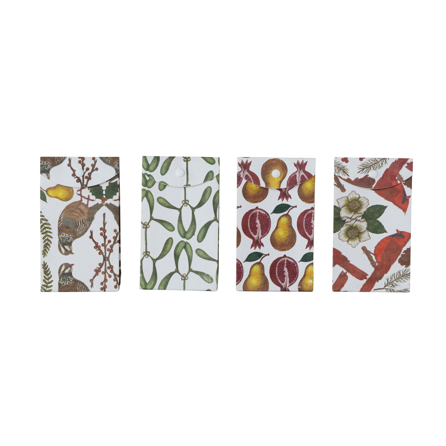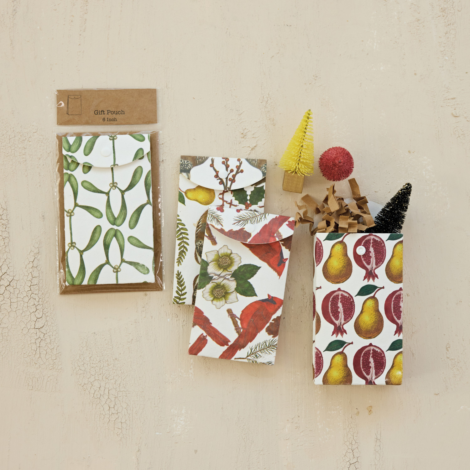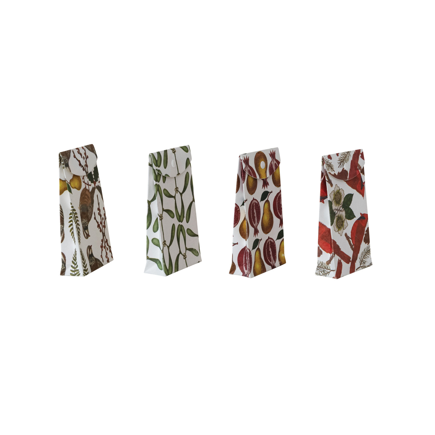 Catalog Name: 3-1/2"L x 1-1/4"W x 6"H Handmade Printed Recycled Paper Gift Bag w/ Seasonal Botanicals/Animals Pattern & Snap Closure, Multi Color, 4 Styles ©