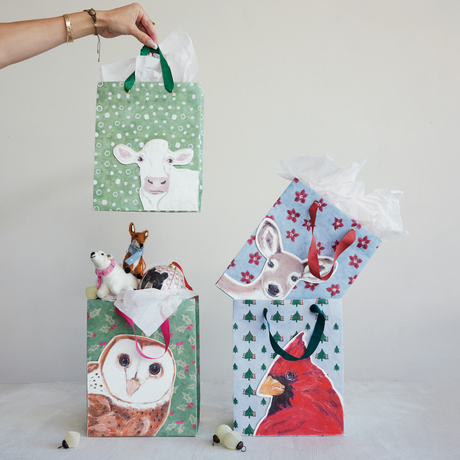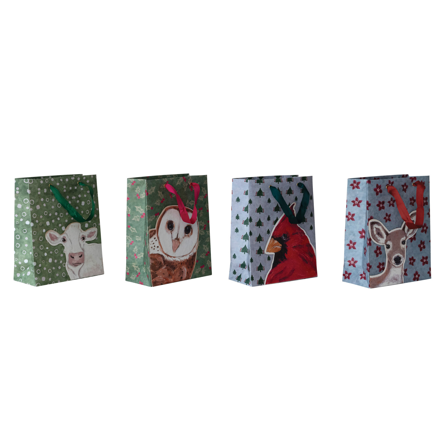 Catalog Name: 8-1/2"L x 4"W x 10-1/2"H Handmade Printed Recycled Paper Gift Bag w/ Holiday Pattern, 3D Animal & Grosgrain Ribbon Handles, Multi Color, 4 Styles ©