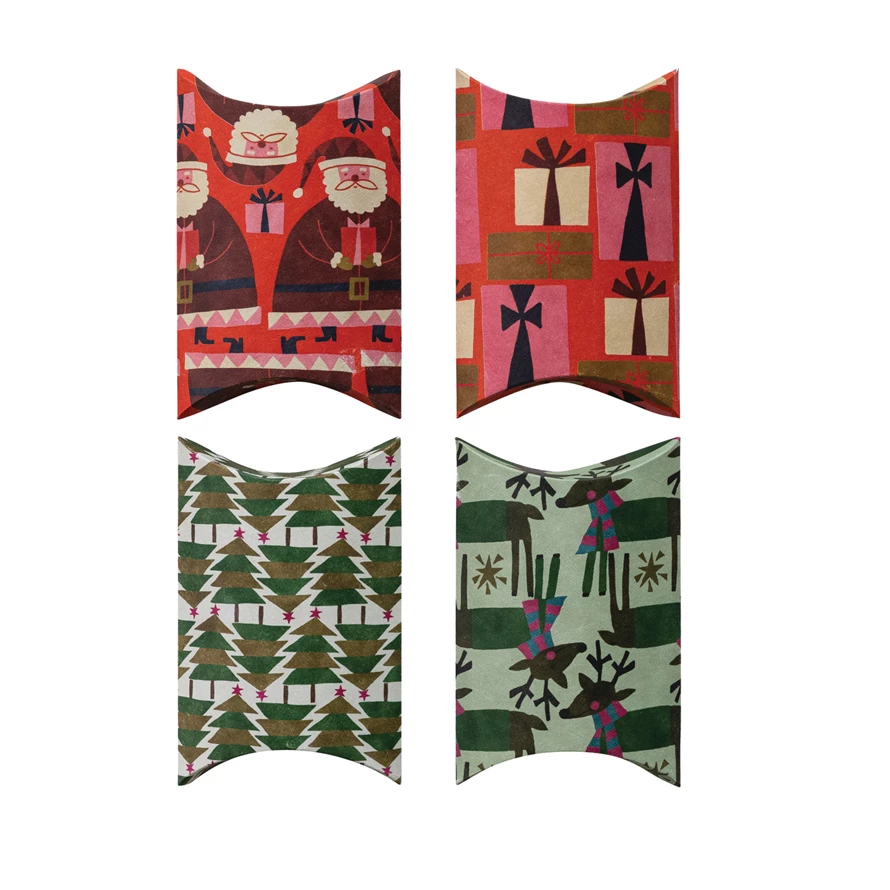 Catalog Name: 6-3/4"L x 4-1/4"W x 1-1/2"H Handmade Printed Recycled Paper Pillow Gift Box w/ Holiday Pattern, Multi Color, 4 Styles ©