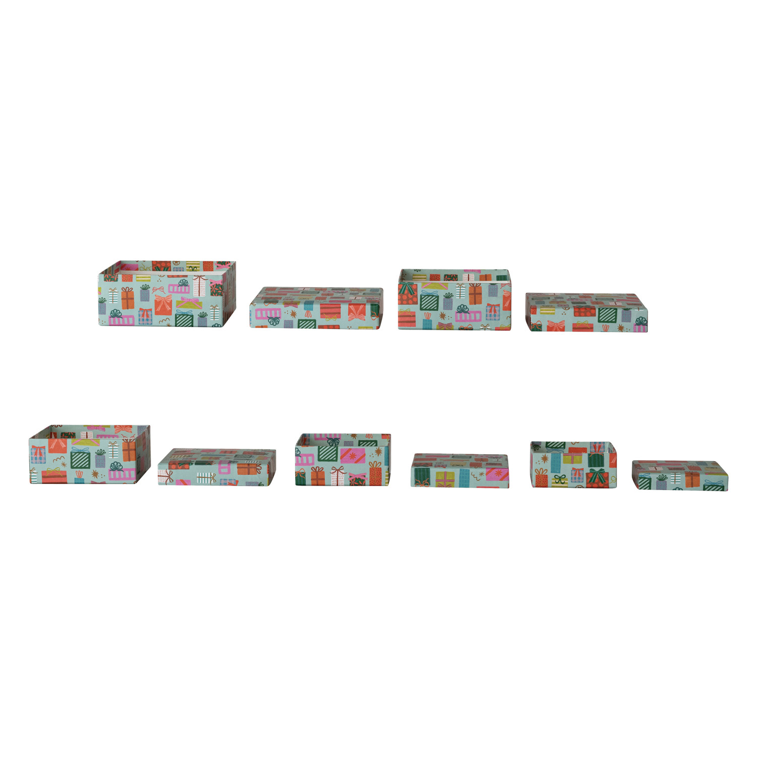 Catalog Name: 9-1/2" Square x 4"H, 8-1/2" Square x 3-1/2"H, 7-1/2" Square x 3"H, 6-1/2" Square x 2-3/4"H & 5-3/4" Square x 2-1/4"H Handmade Printed Recycled Paper Gift Boxes w/ Gift Box Pattern, Multi Color, Set of 5 ©