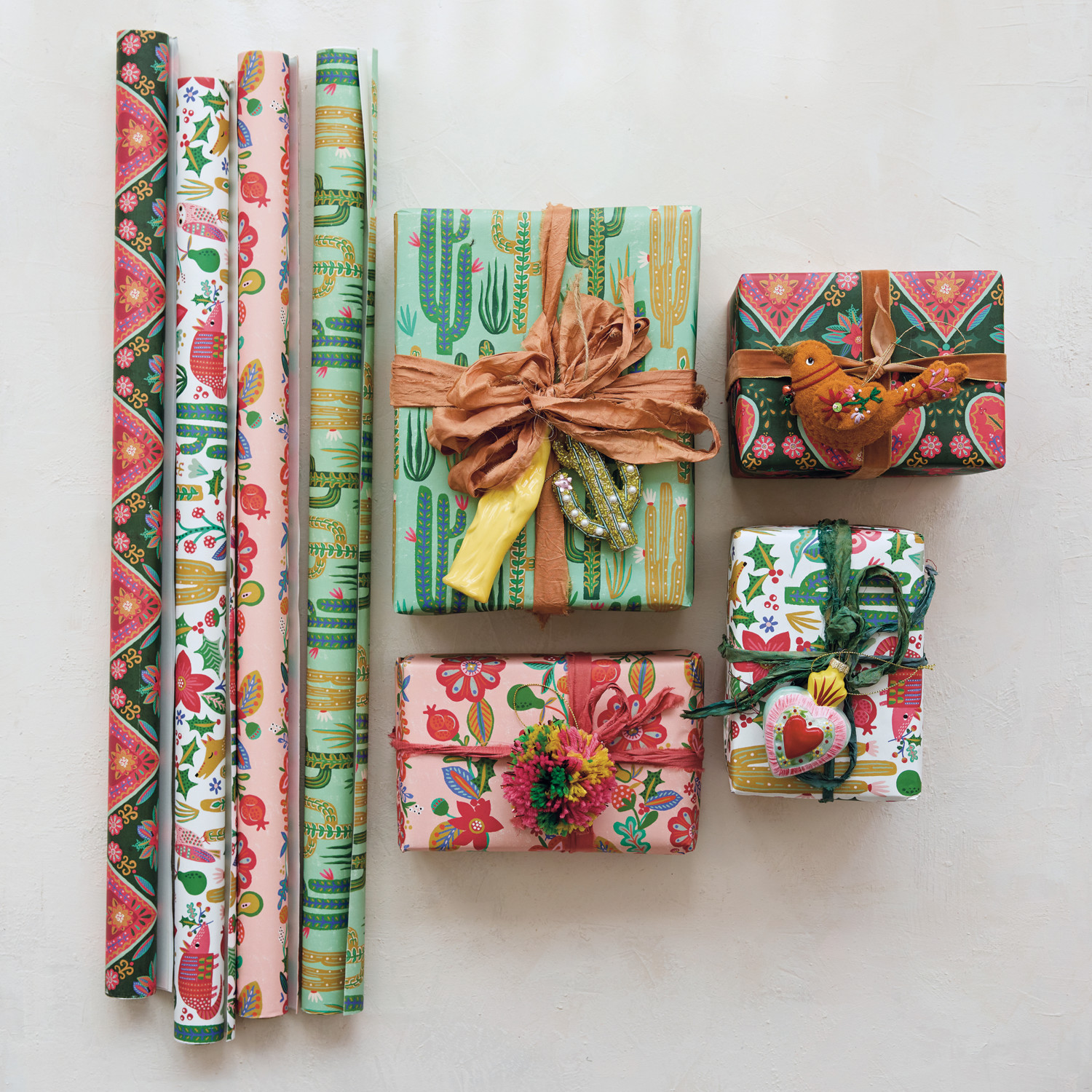 Catalog Name: 28"L x 20"W Handmade Printed Recycled Wrapping Paper Sheets w/ Seasonal Patterns, Multi Color, 4 Styles, Set of 12 Rolls in Kraft Display Box (3 Sheets Per Roll, 3 Rolls Per Style) ©