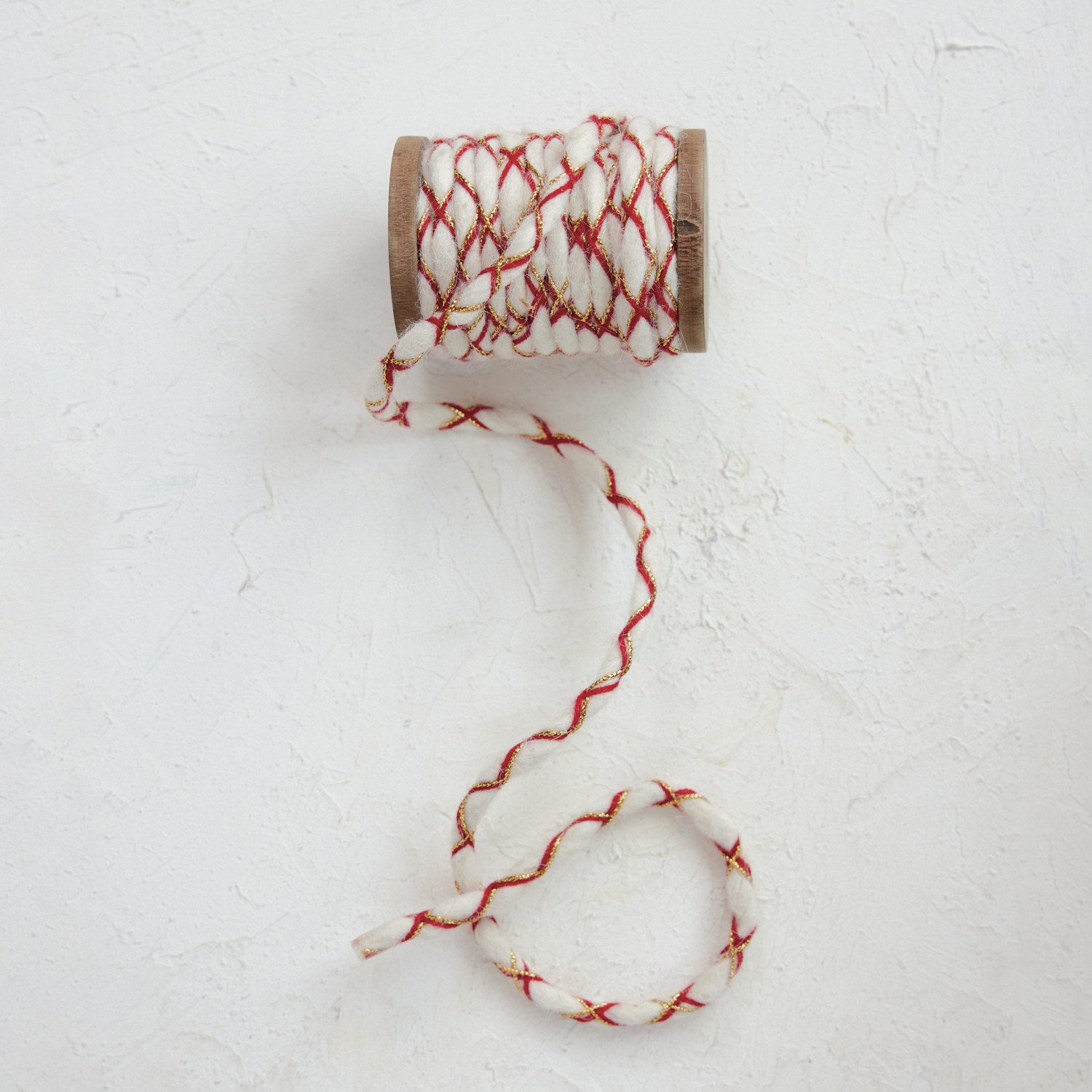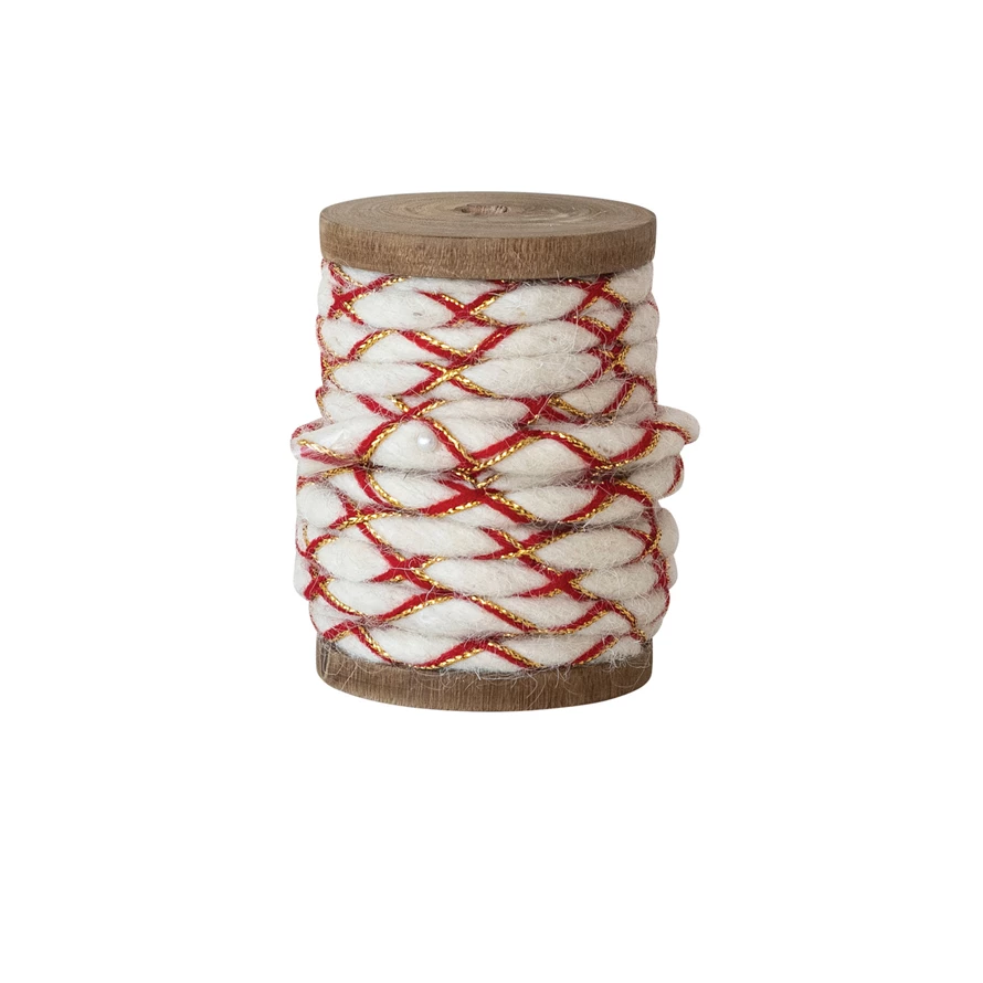 Catalog Name: 10 Yard 1/4"W Acrylic & Woven Fabric Cord w/ Metallic Thread on Wood Spool, White, Red & Gold Color