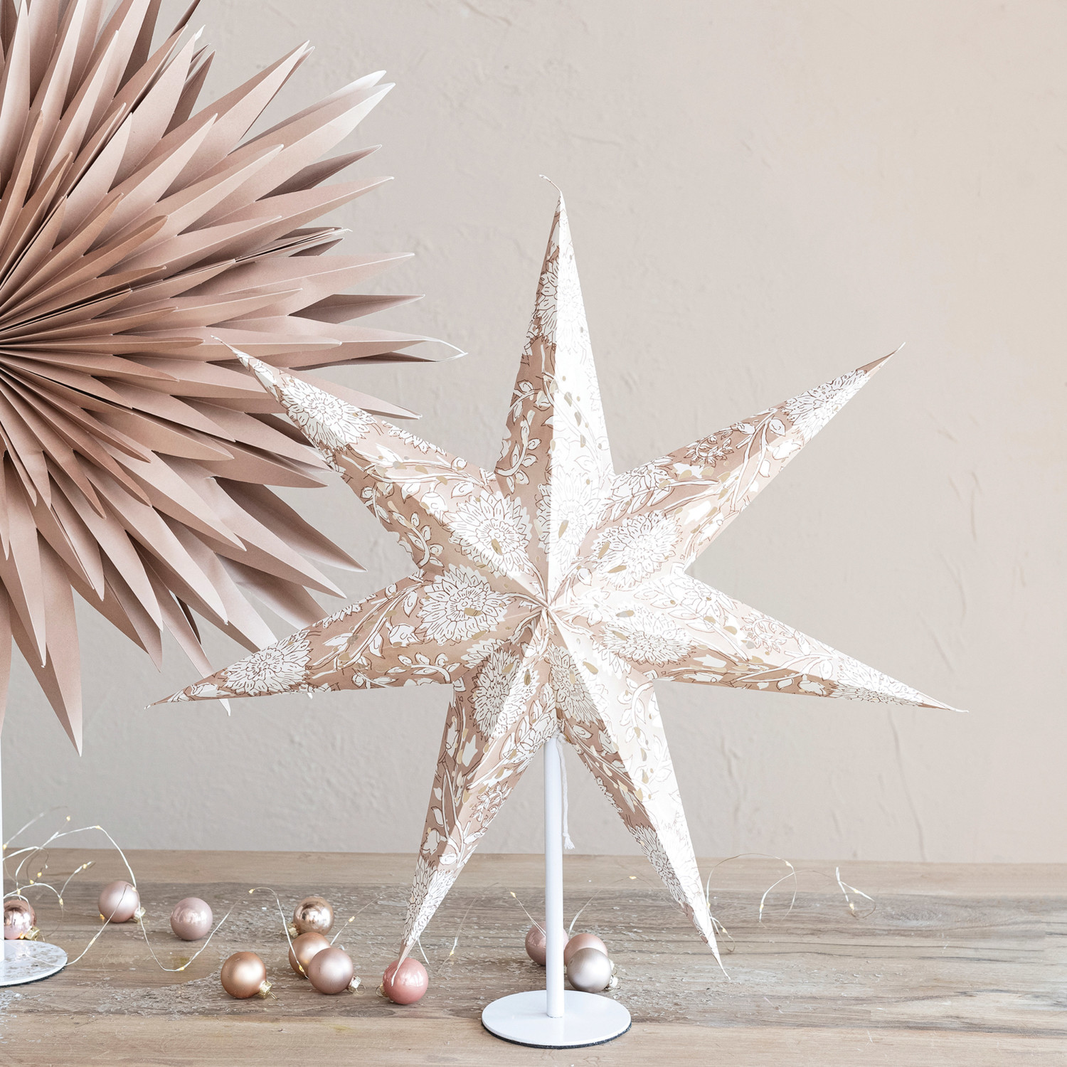 Catalog Name: 24"L x 7-1/2"W x 25"H Printed Recycled Paper Folding Star w/ Pattern, LED Light String & White Metal Stand, Brown & Cream Color (3-AA Batteries Required)
