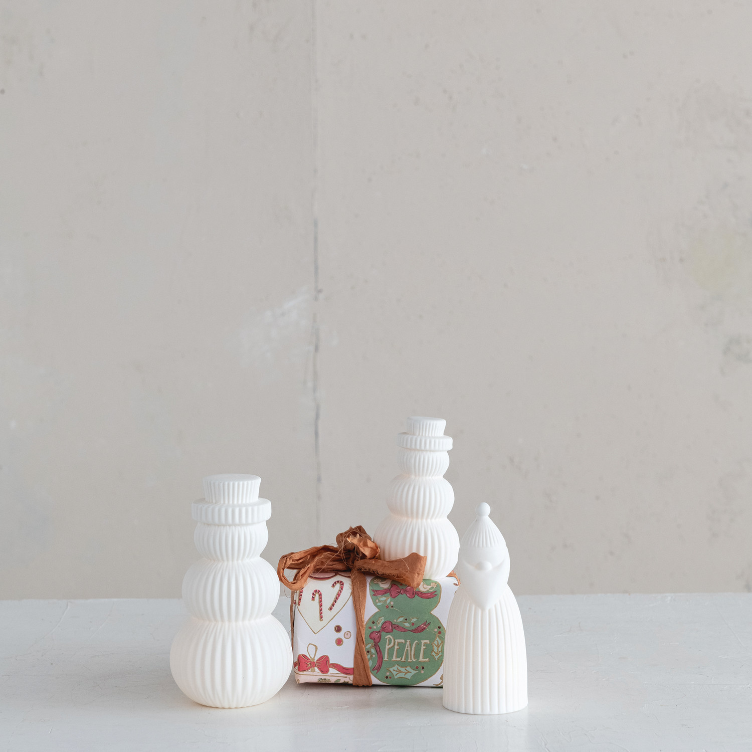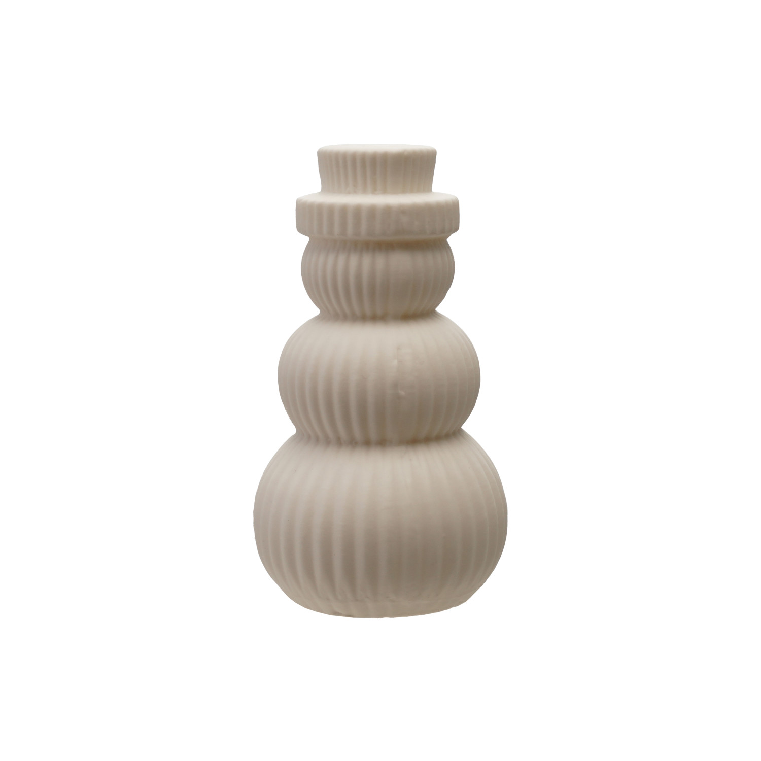 Catalog Name: 4" Round x 7"H Stoneware Bisque Pleated Snowman Shaped LED Light, White (Batteries Included)