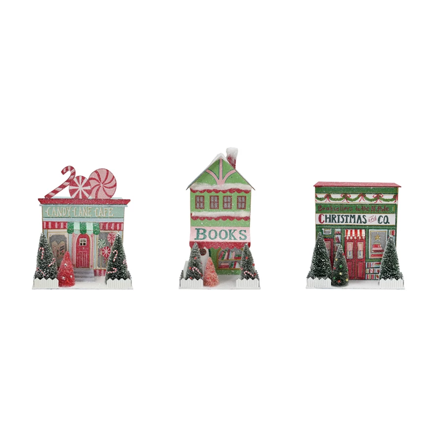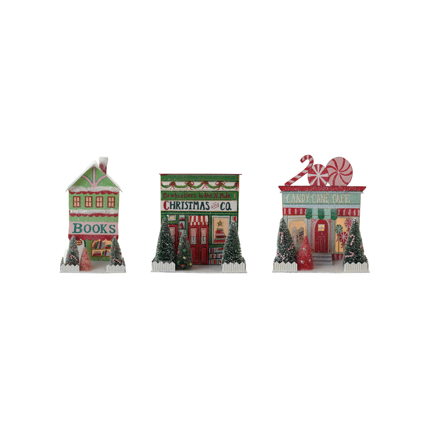 Catalog Name: 8-3/4"H - 12"H Paper Christmas Village Store w/ Sisal Bottle Brush Trees, Glitter & LED Light, 3 Styles (Batteries Included) ©