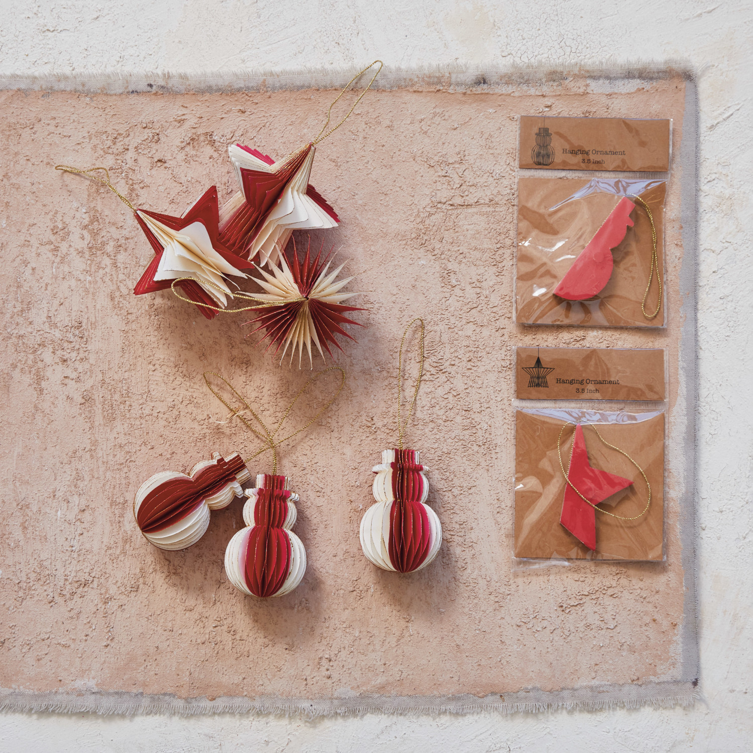 This paper folding honeycomb star ornament set with gold glitter edge is a sparkling and festive way to add some personality and flair to the home. The set includes 2 star ornaments in red and cream colors, each with a paper folding honeycomb design and a gold glitter edge that catches the light. The ornaments have a lurex thread loop for easy hanging. They are made of paper, lurex thread, and organic materials, making them lightweight and eco-friendly. Decorate the wall, ceiling, or Christmas tree, or use them as a gift or a toy as this ornament set will bring a touch of beauty and elegance to any space. It also makes a great gift for friends and family who love stars or paper crafts. A sparkling and festive set of star ornaments with paper folding honeycomb design and gold glitter edge. A gorgeous accessory for any classic, elegant, or celestial style decor. Ideal for hanging on the wall, ceiling, or Christmas tree, or using as a gift or a toy.