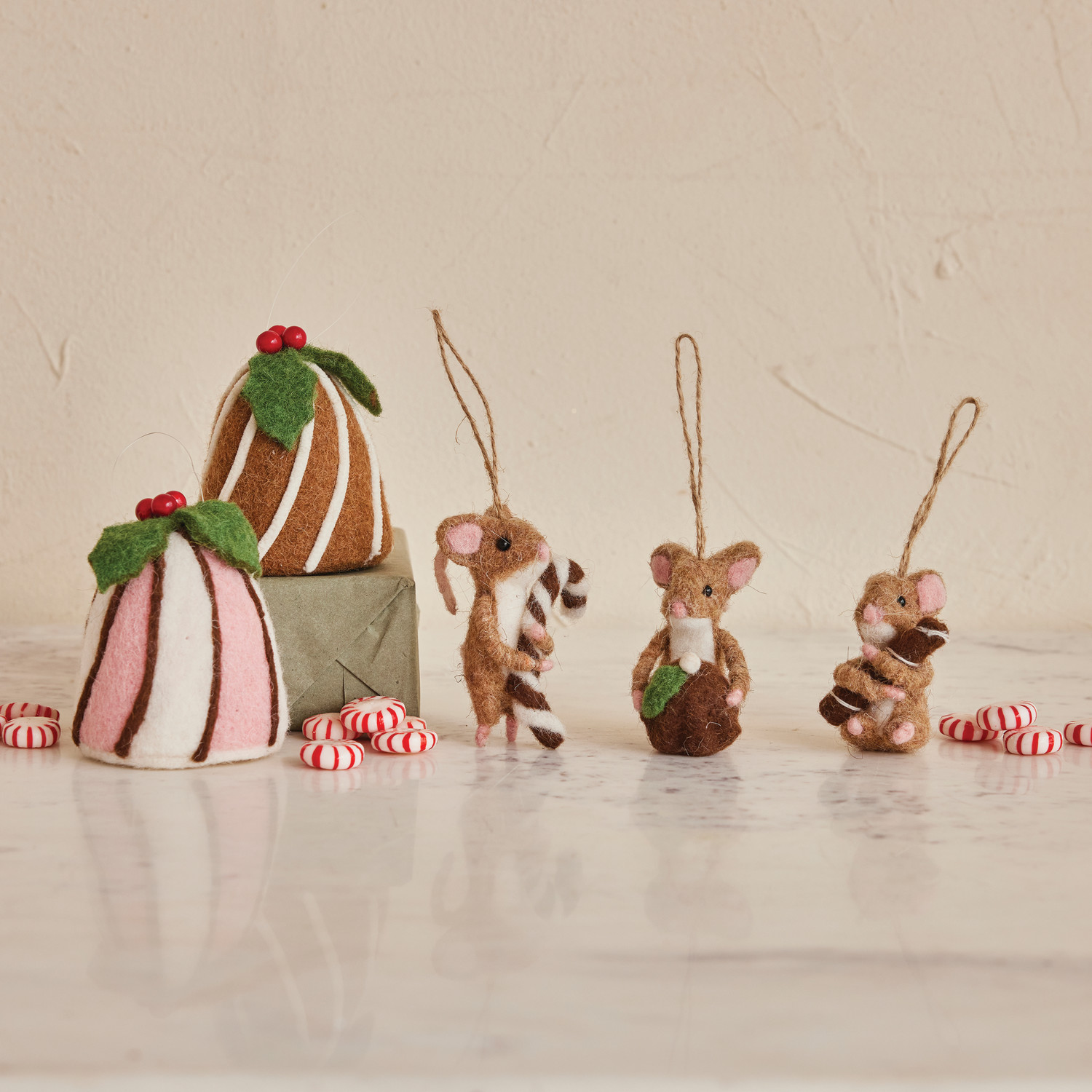 Catalog Name: 2-3/4"H - 4-1/4"H Handmade Wool Felt Mouse Ornament, Brown, 3 Styles