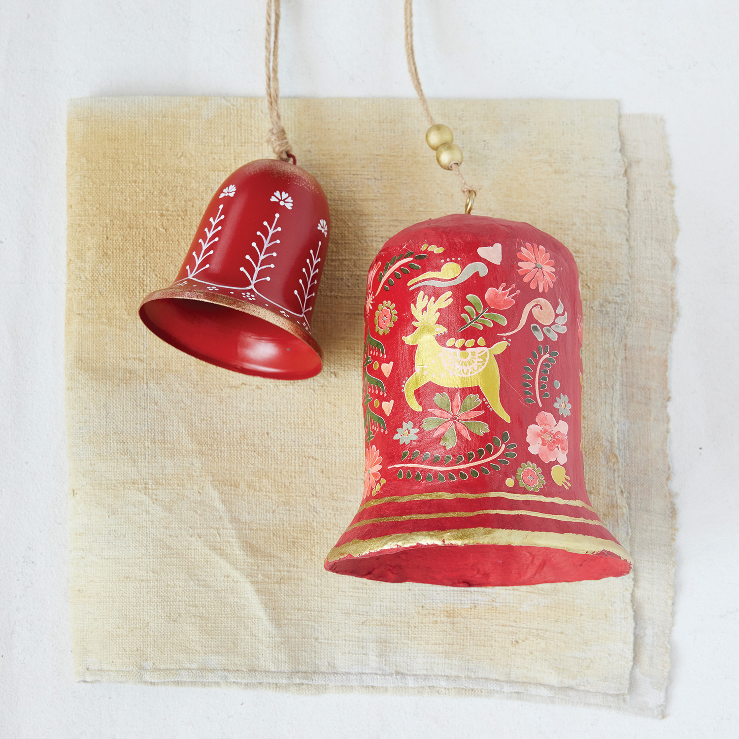 Catalog Name: 3-3/4" Round x 4-1/4"H Hand-Painted Metal Bell Ornament w/ Botanical Design, Red & Gold Finish