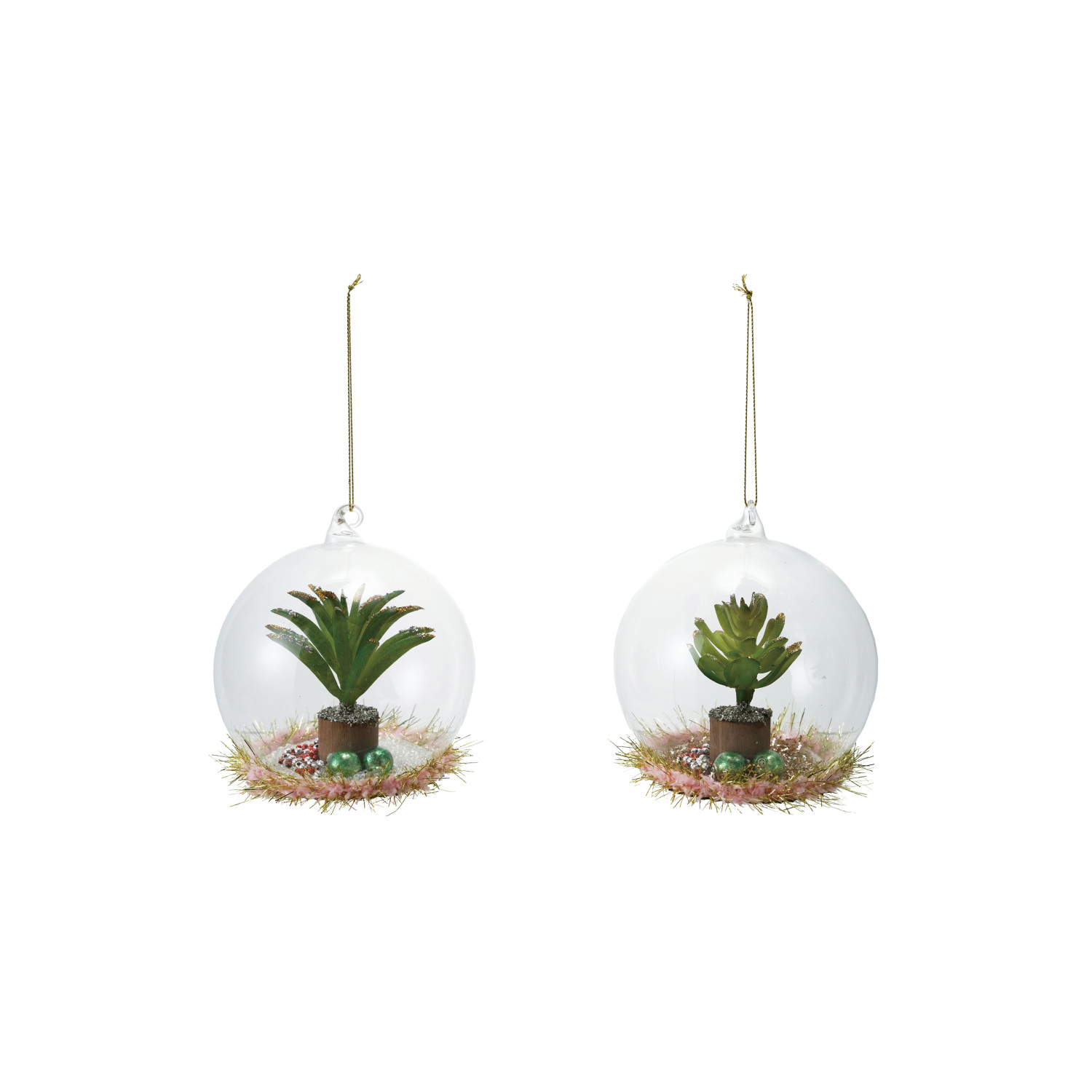 Catalog Name: 4-1/2" Round Glass Snow Globe Ornament w/ Plastic Plant & Tinsel Base, Multi Color, 2 Styles