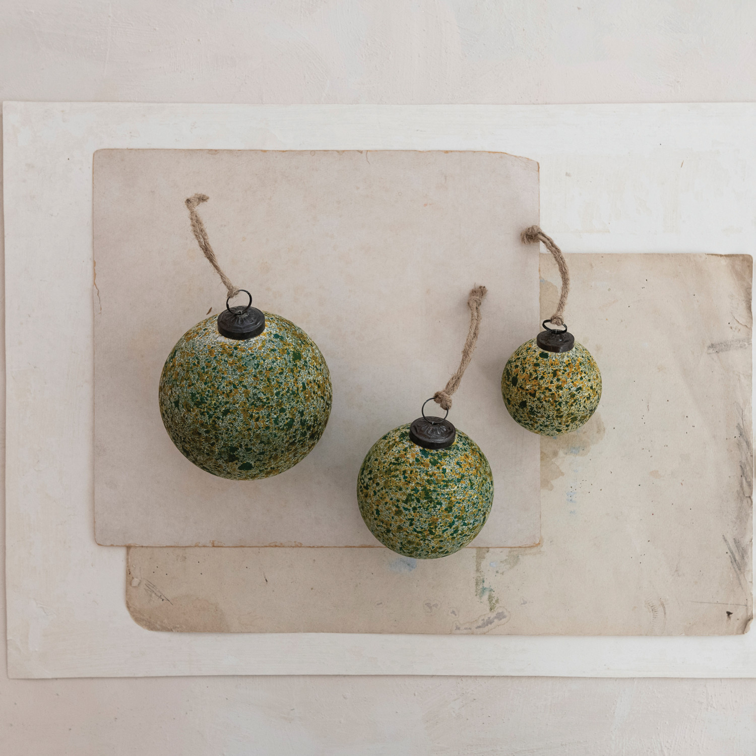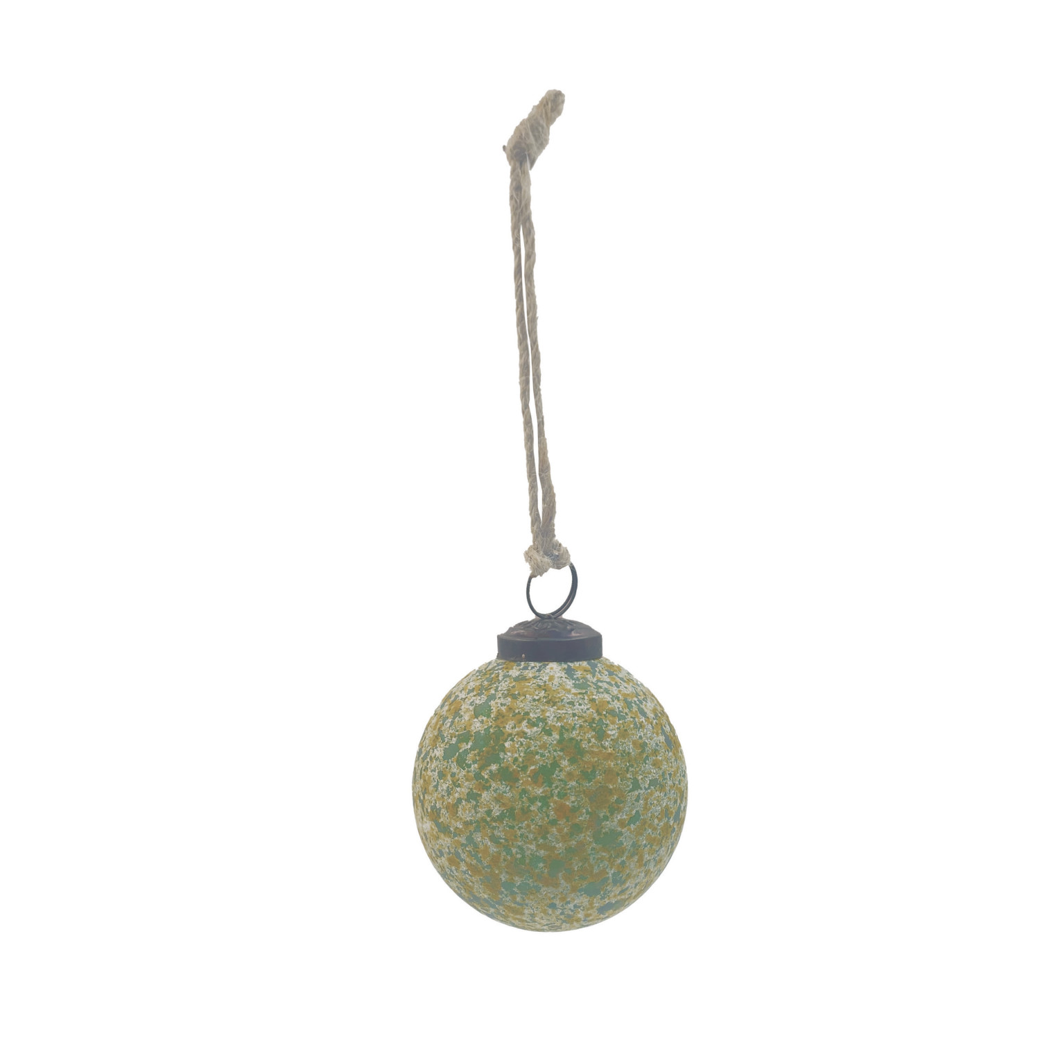 Catalog Name: 3" Round Glass Ball Ornament, Distressed Green & Gold Finish