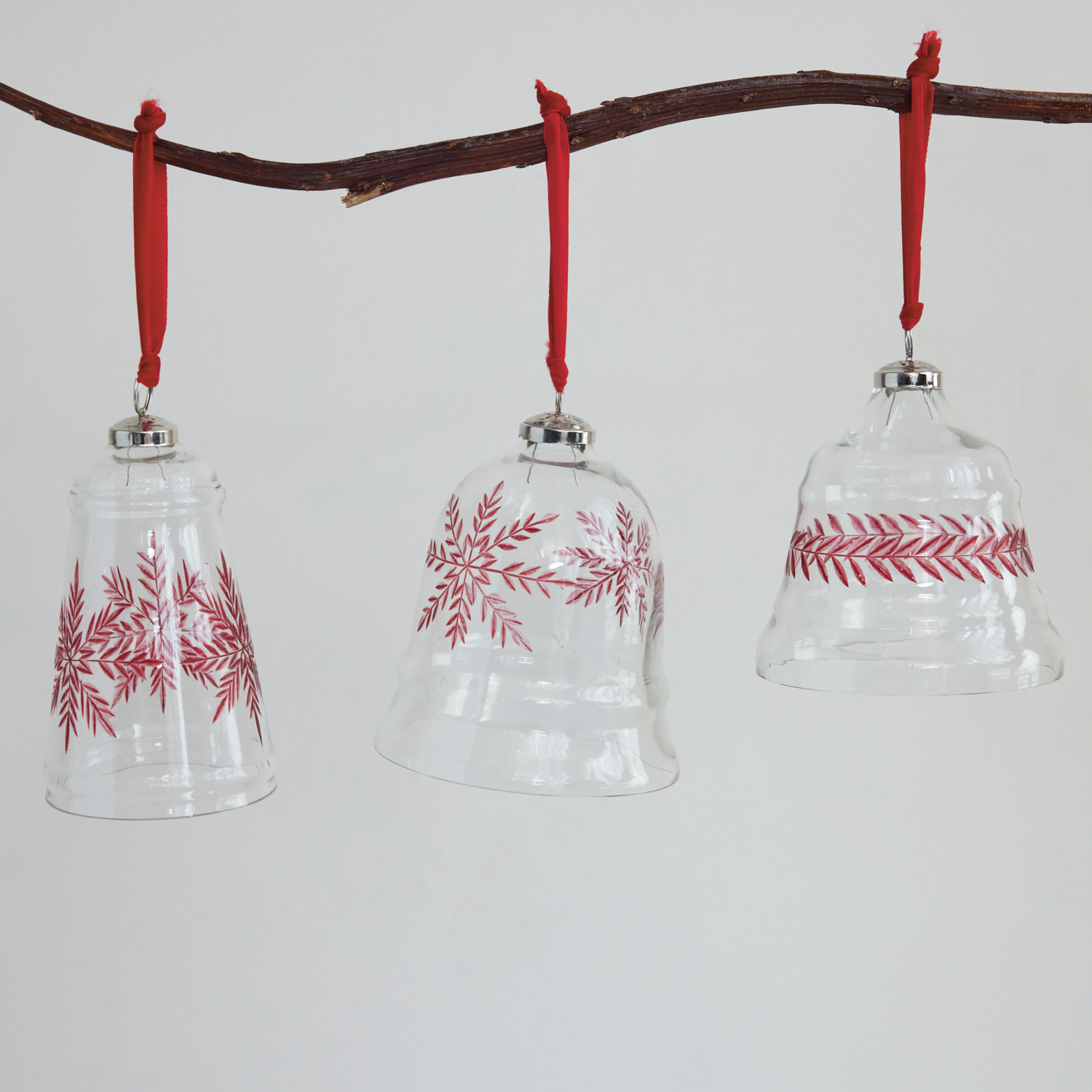 Hand-Blown Etched Glass Bell Shaped Ornament with Red Velvet Ribbon, Red, 3 Styles