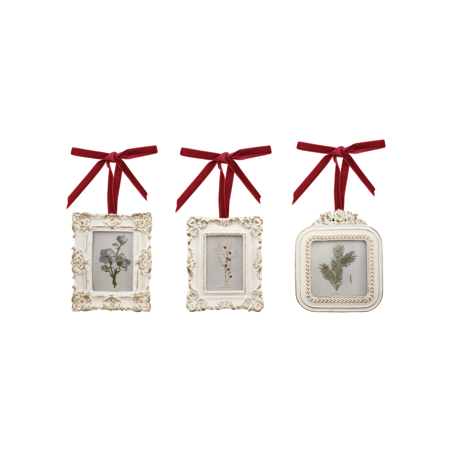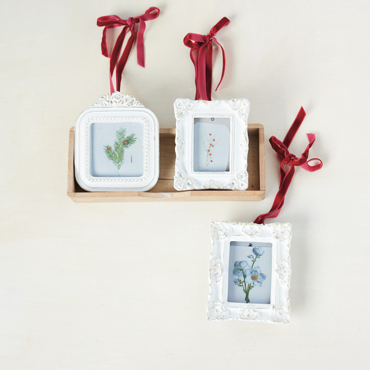 Catalog Name: 4-3/4"H Resin Photo Frame Ornament w/ Burgundy Velvet Ribbon, White, 3 Styles (Holds 2-1/2" x 3-1/2", 2" x 3" or 3" x 3" Photo)