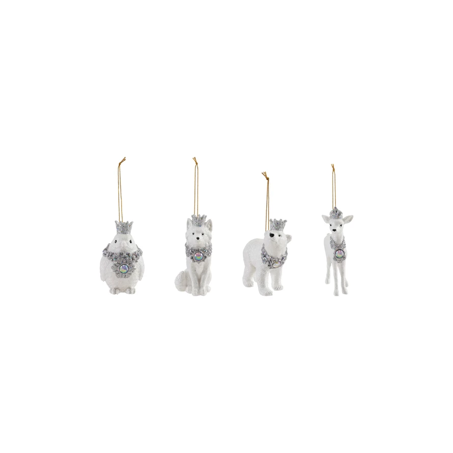 Catalog Name: 3-1/2"L - 4-1/2"L Resin Animal Ornament w/ Crown, Jewels & Glitter, White & Silver Finish, 4 Styles