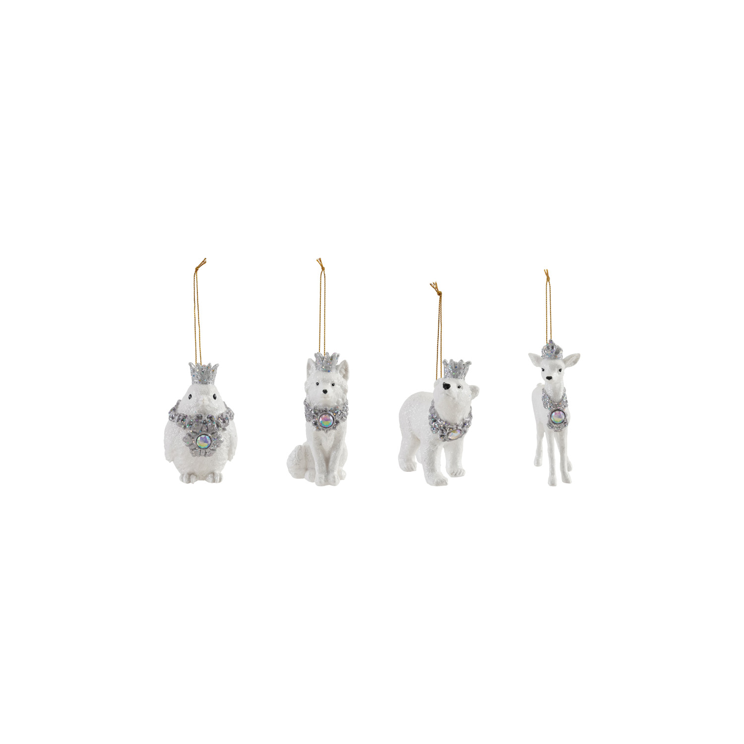 Resin Animal Ornament with Crown, Jewels & Glitter, White & Silver Finish, 4 Styles