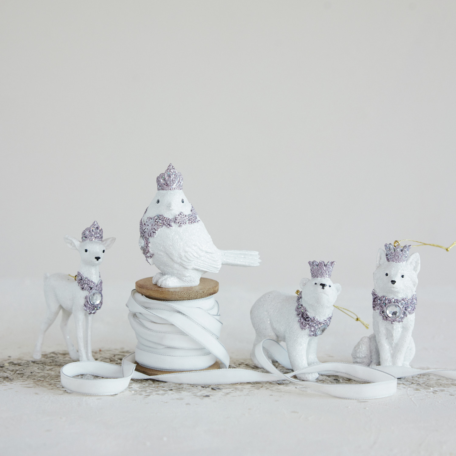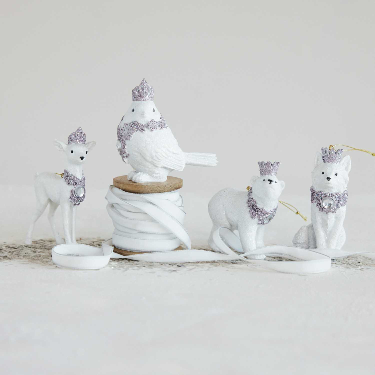 Catalog Name: 3-1/2"L - 4-1/2"L Resin Animal Ornament w/ Crown, Jewels & Glitter, White & Silver Finish, 4 Styles