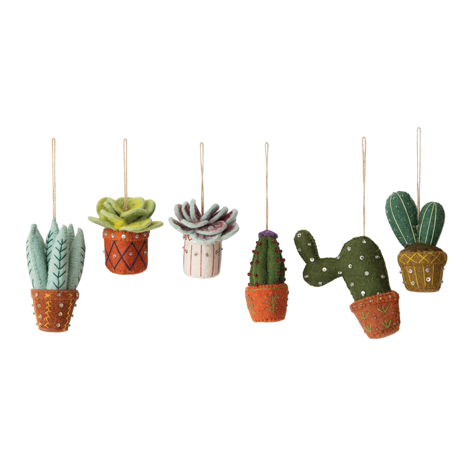 Handmade Wool Felt Cactus in Planter Ornament with Embroidery, Sequins & Beads, 6 Styles