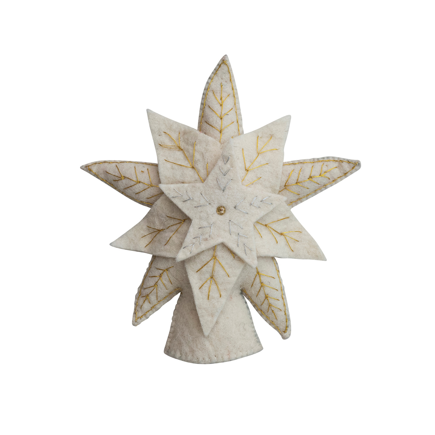 Catalog Name: 6-1/2"L x 1-1/2"W x 8-1/2"H Handmade Wool Felt Star Tree Topper w/ Metallic Thread Embroidery, Cream Color