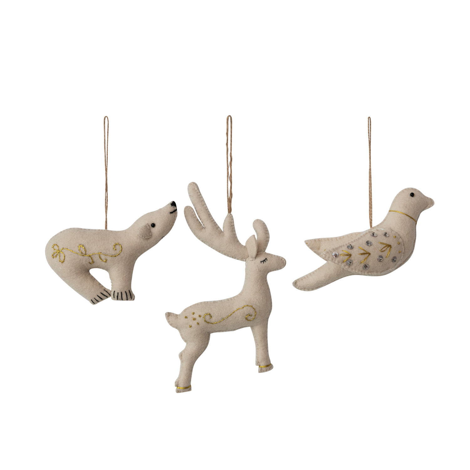 Catalog Name: 3-1/2"H - 5-1/2"H Handmade Wool Felt Animal Ornament w/ Metallic Gold Thread Embroidery, Sequins & Beads, Cream Color, 3 Styles