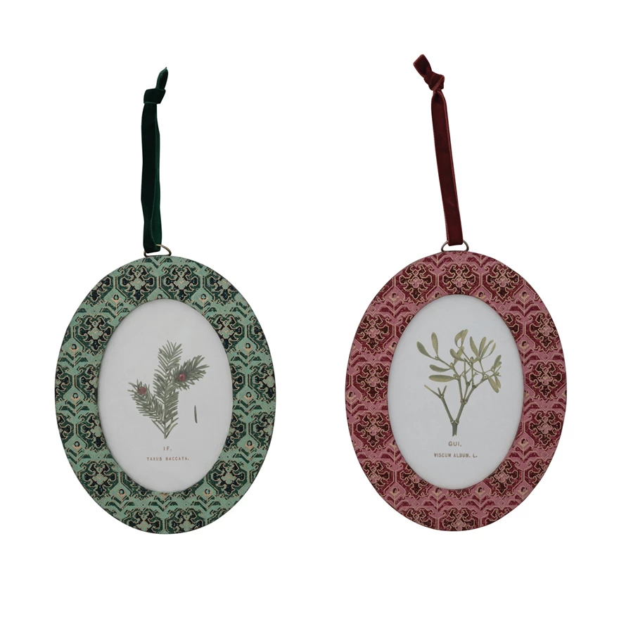 Catalog Name: 6-3/4"H Oval Metal & Handmade Recycled Block Printed Paper Photo Frame Ornament w/ Pattern & Velvet Ribbon Hanger, 2 Styles