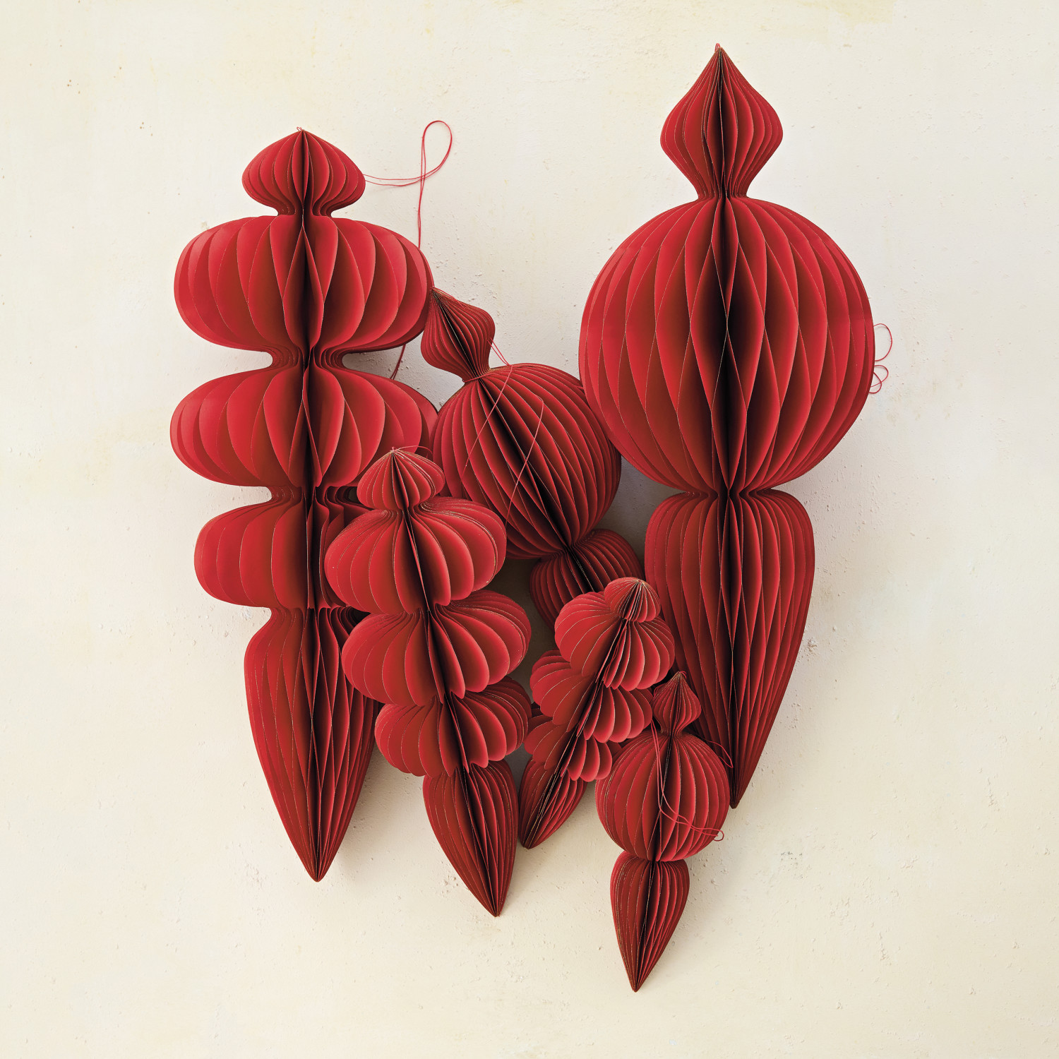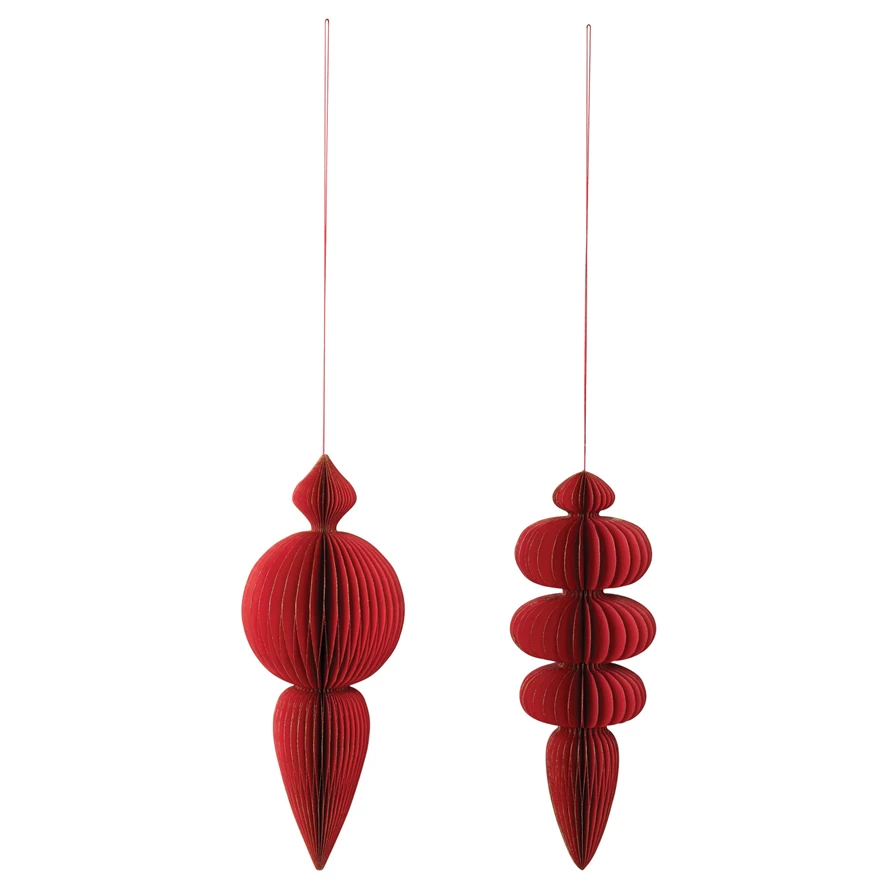 Catalog Name: 7" Round x 18"H Oversized Handmade Recycled Paper Folding Honeycomb Finial Ornament w/ Gold Glitter Edges, Red, 2 Styles