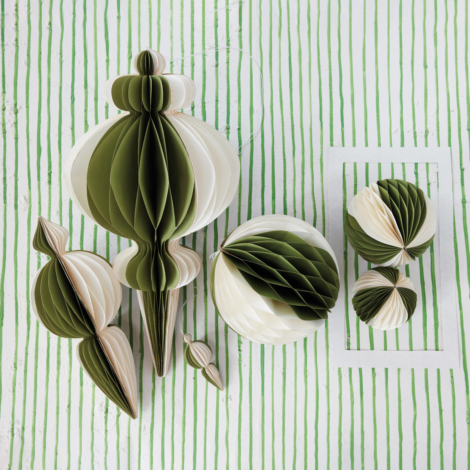 Catalog Name: 13" Round x 26"H Oversized Handmade Recycled Paper Folding Honeycomb Finial Ornament w/ Gold Glitter Edges, Green & Ivory Color