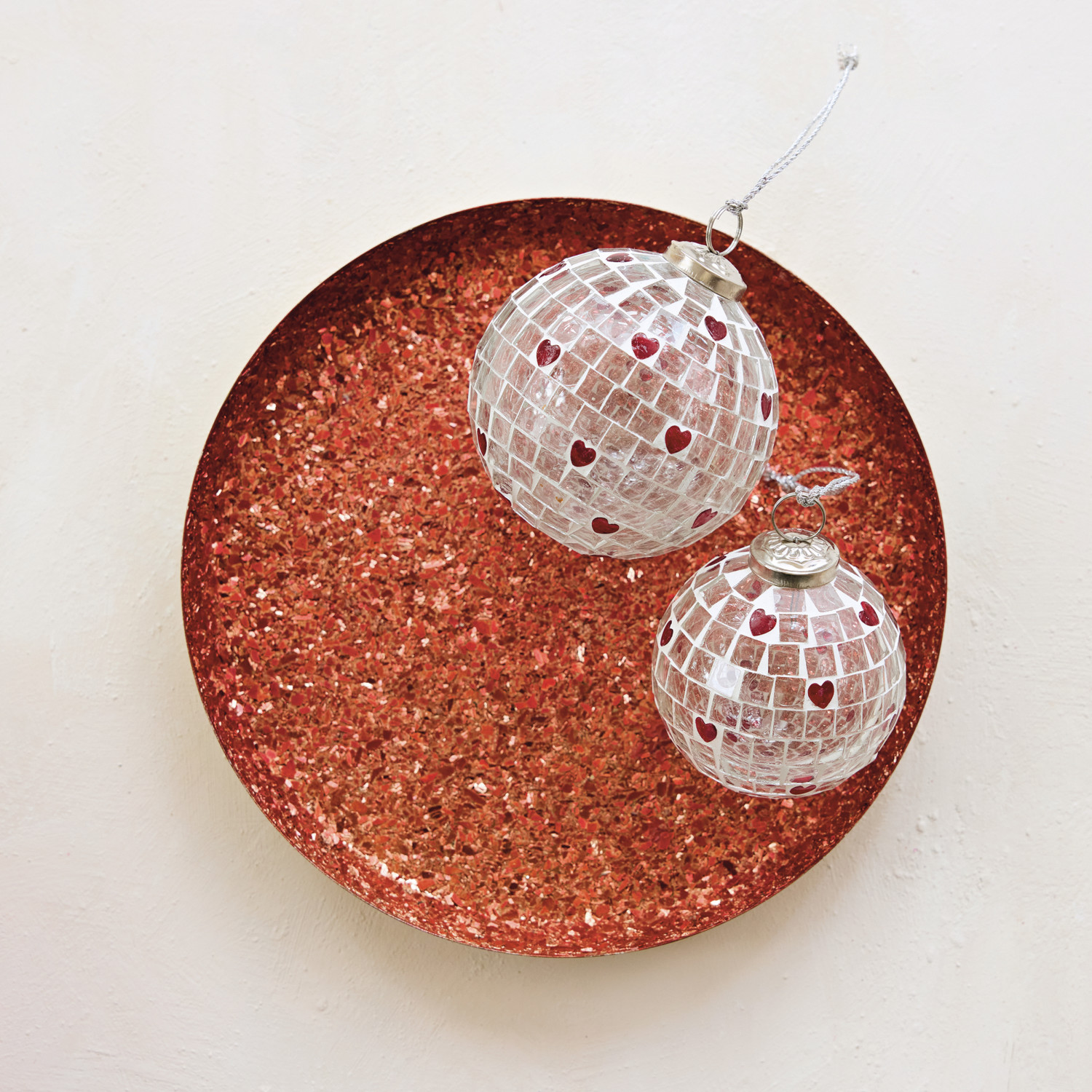 Glass Mosaic Ball Ornament with Hearts, Red & White