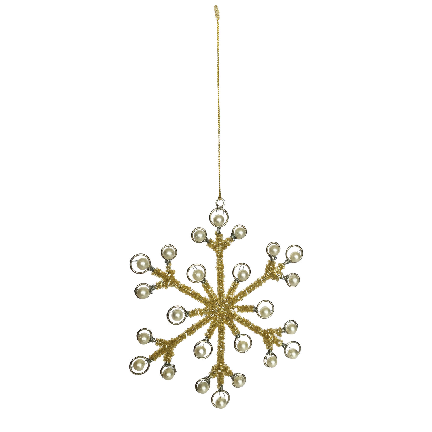 Metal Beaded Snowflake Ornament with Faux Pearls, Gold Finish