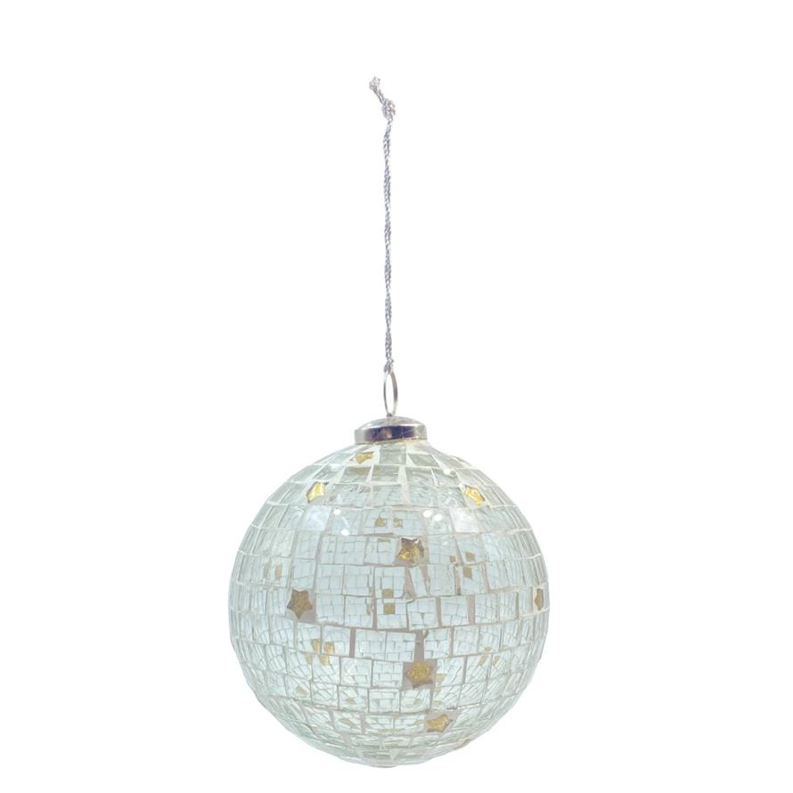 Glass Mosaic Ball Ornament with Stars, Gold Finish & White