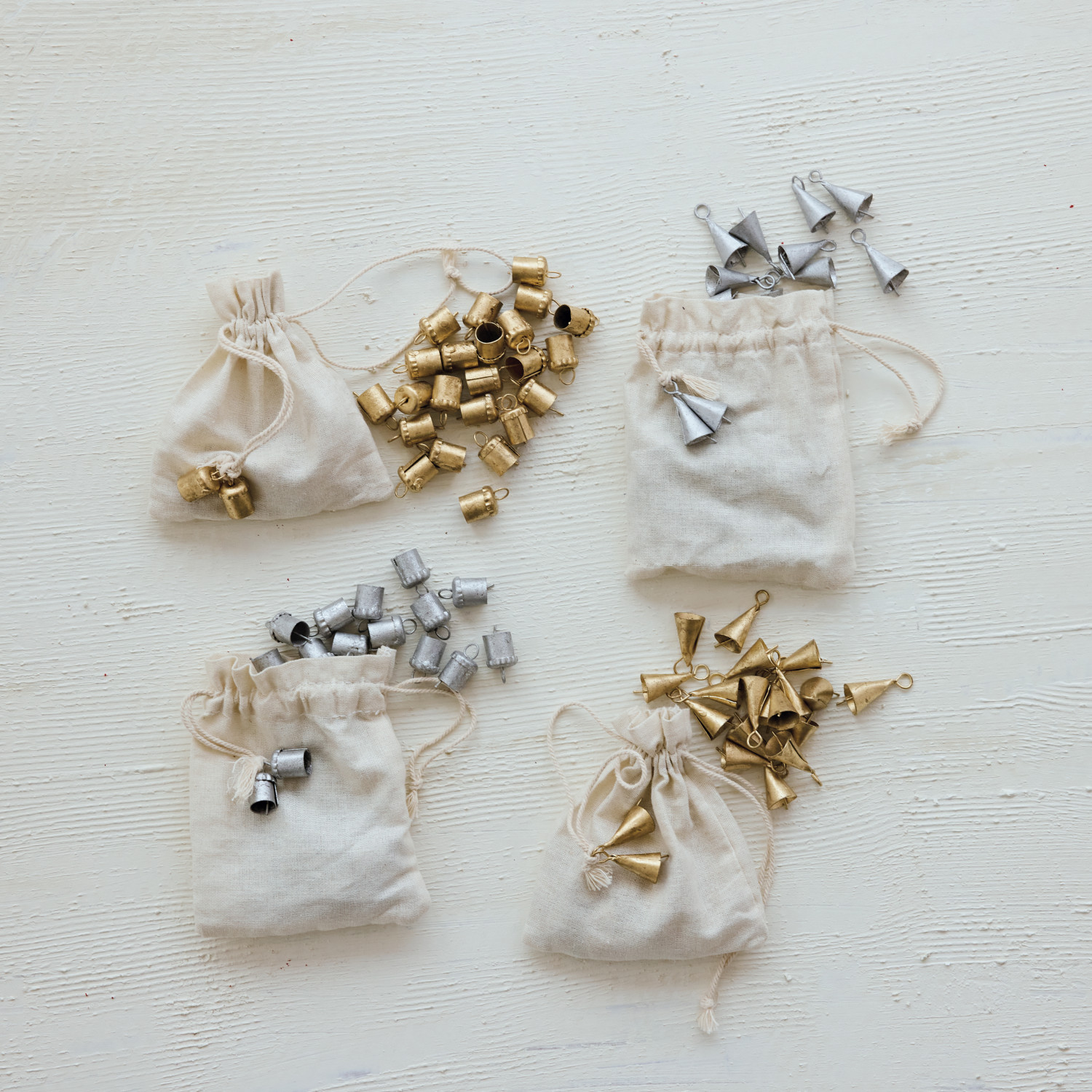 Metal Bells, Set of 36 in Drawstring Bag, 2 Styles, 2 Finishes