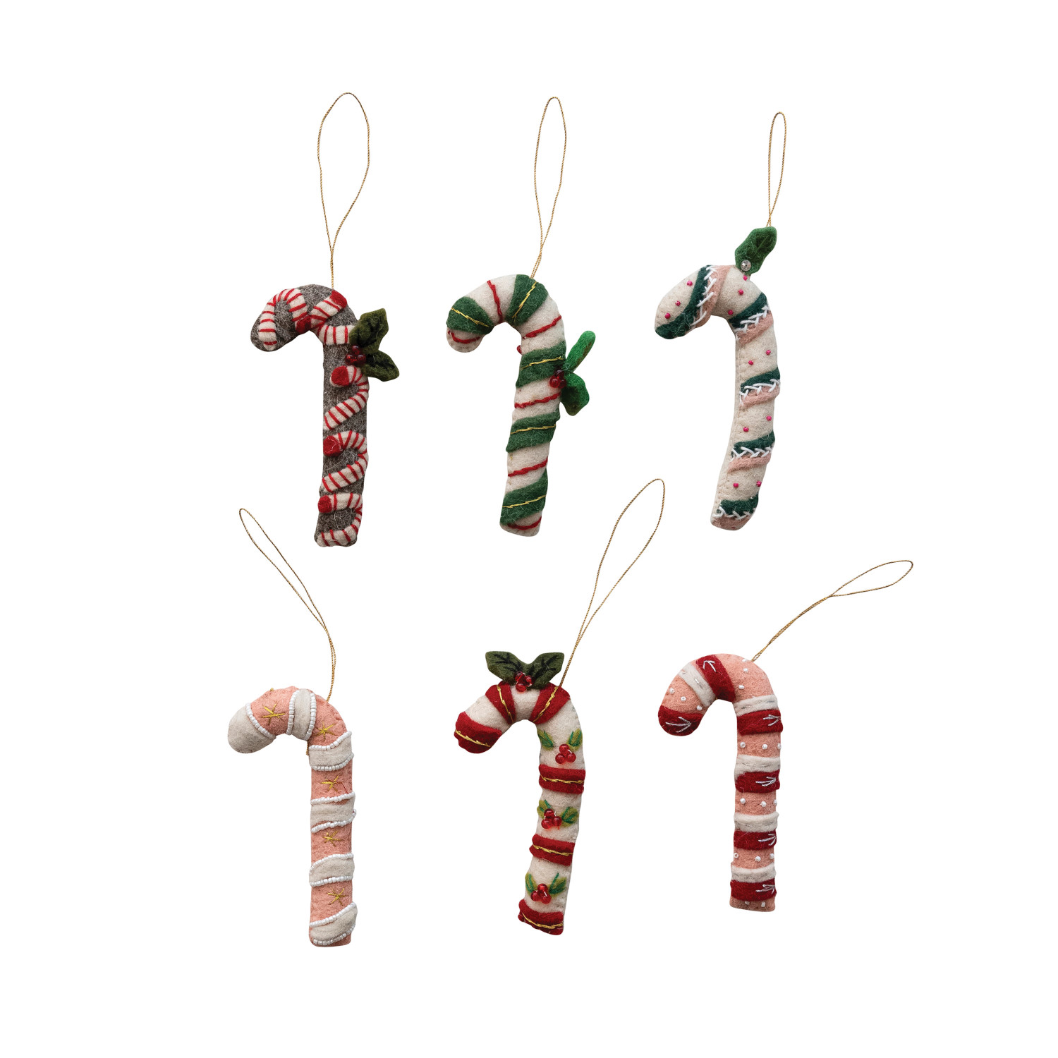 Catalog Name: 5"H Handmade Wool Felt Candy Cane Ornament w/ Applique, Embroidery & Beads, Multi Color, 6 Styles