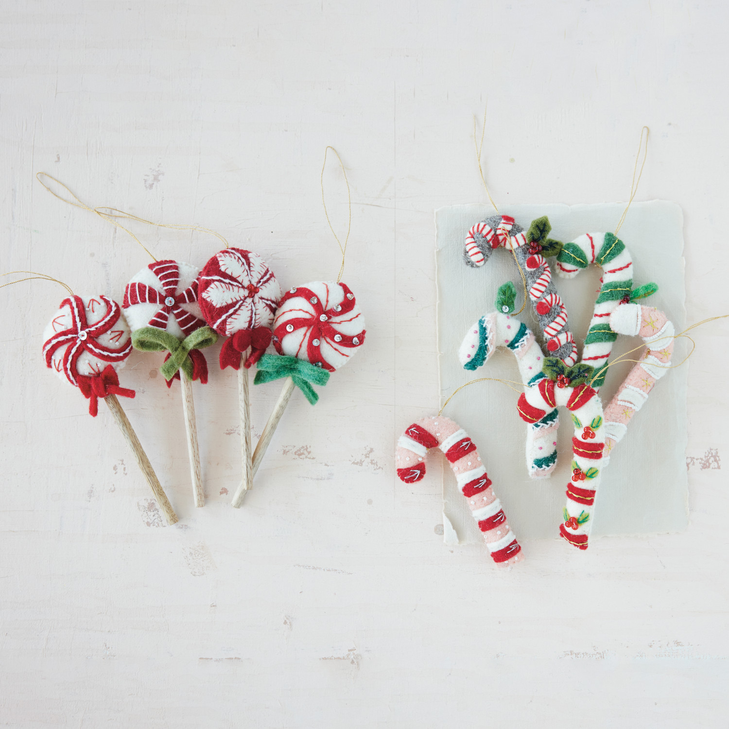 Handmade Wool Felt Candy Cane Ornament with Applique, Embroidery & Beads, 6 Styles